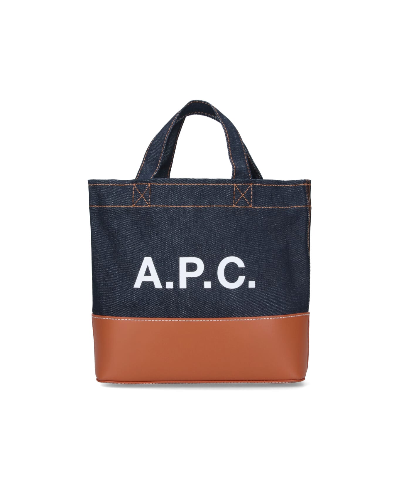 A. P. C. Axel mini tote bag in blue denim with leather trim, two handles, adjustable shoulder strap, white logo print on the front, interior zipper pocket, and main interior compartment.