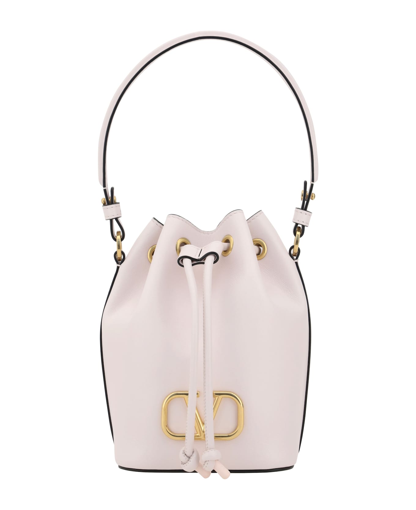 The valentino garavani mini vlogo drawstring bucket bag in lambskin is a sophisticated and functional accessory. the flat handle adds a touch of character and luxury, while the front drawstring closure combines practicality and style. the interior, with a single compartment, offers enough space for essentials. the iconic metal monogram applied on the front adds a distinctive and high-class detail. complete every look, both casual and elegant, thanks to the removable flat shoulder strap, ideal for those seeking versatile and bold elegance.