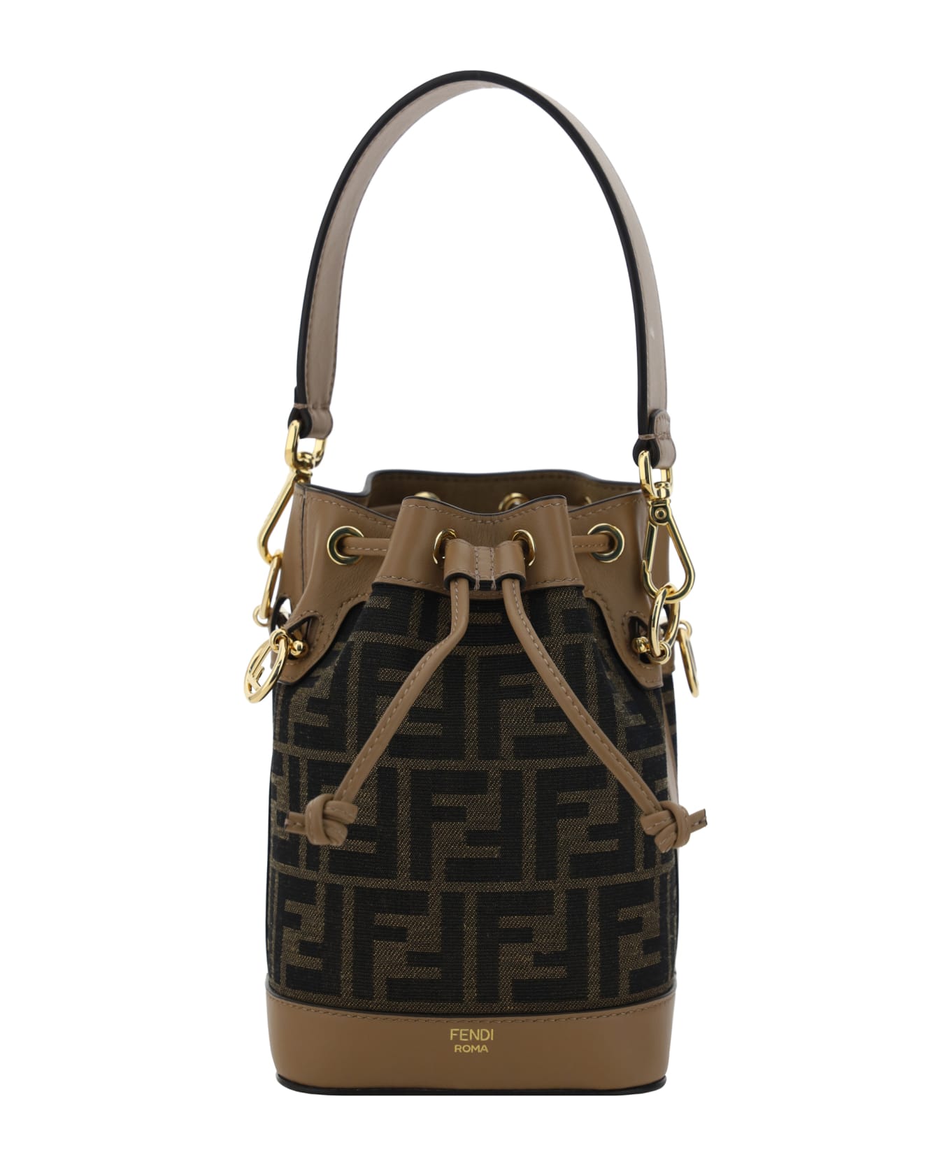 Mon tresor mini bucket bag by fendi, removable and adjustable leather shoulder strap, removable leather handle, raffia design with iconic brand logo ff repeated all-over jacquard, front closure with drawstring.