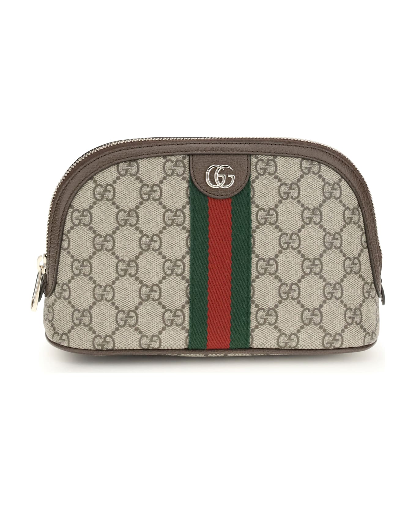 The ophidia beauty case by gucci is an elegant accessory that echoes the house's tradition with iconic details. the web ribbon and the double g emblem in a light gold finish are distinctive symbols of the brand, while the soft coated fabric with gg monogram lends a touch of luxury. inside, the green cotton lining offers a refined contrast, adding another classy detail. perfect for holding beauty products but also versatile enough to store everyday essentials, this beauty case is a practical and chic accessory, ideal for those seeking functionality without sacrificing style.