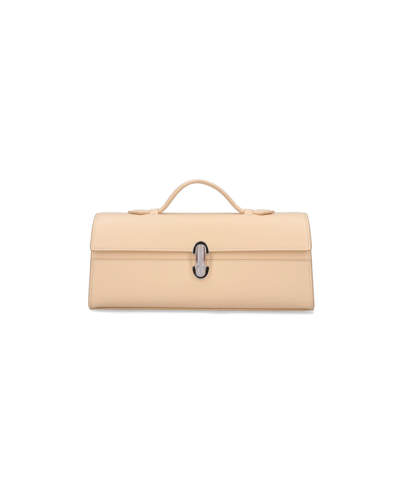 Savette 'Slim Symmetry' cream calf leather pouch with handle, turn-lock flap closure, silver logo embossed on the front, inner slip pocket, main inner compartment.