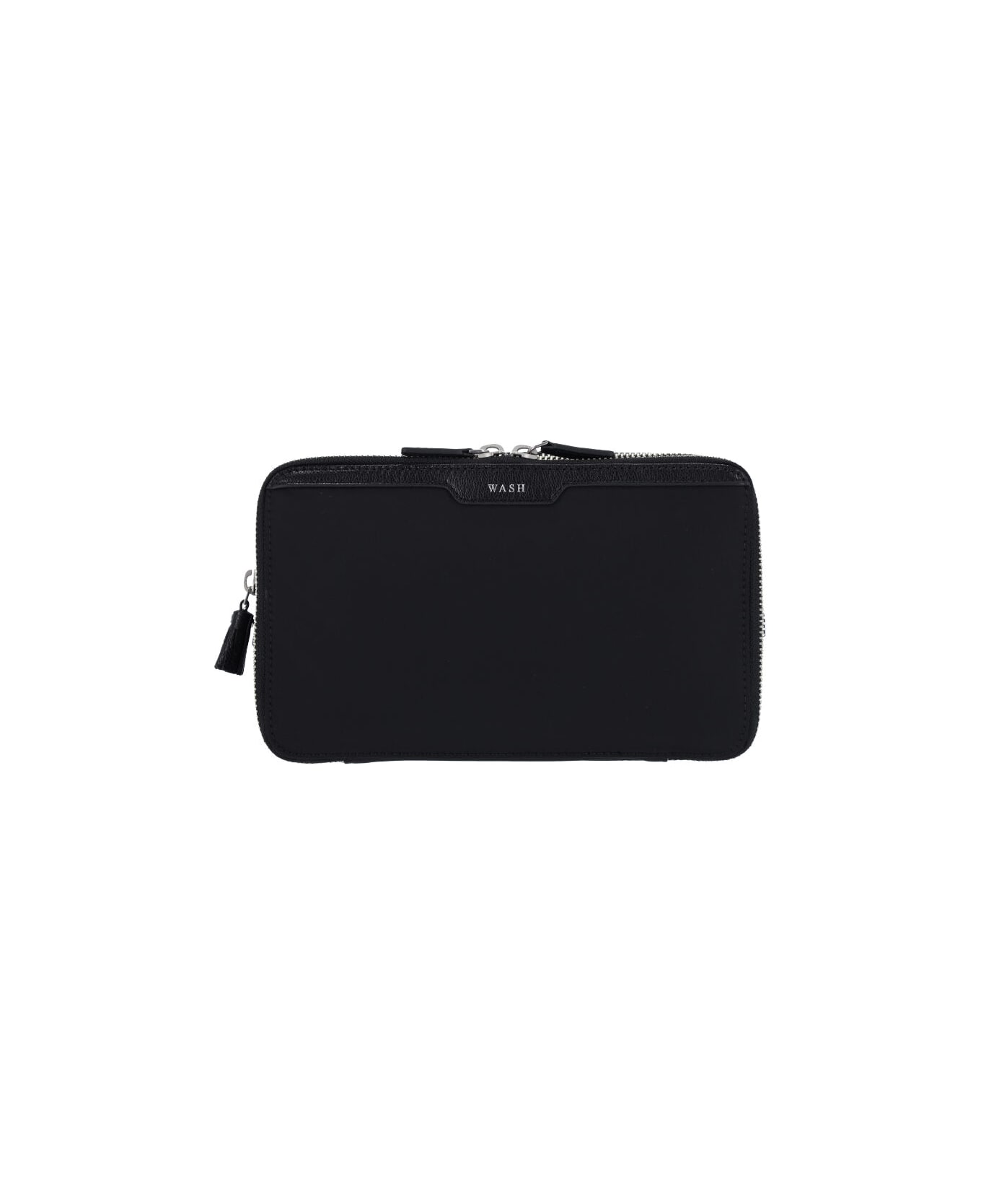 Anya Hindmarch 'Wash Bag' pouch in black nylon with leather trim, double zip closure, zipper tassel detail, gold logo embossed on the front, inner flat pocket, inner zip pocket, two separate inner compartments.
