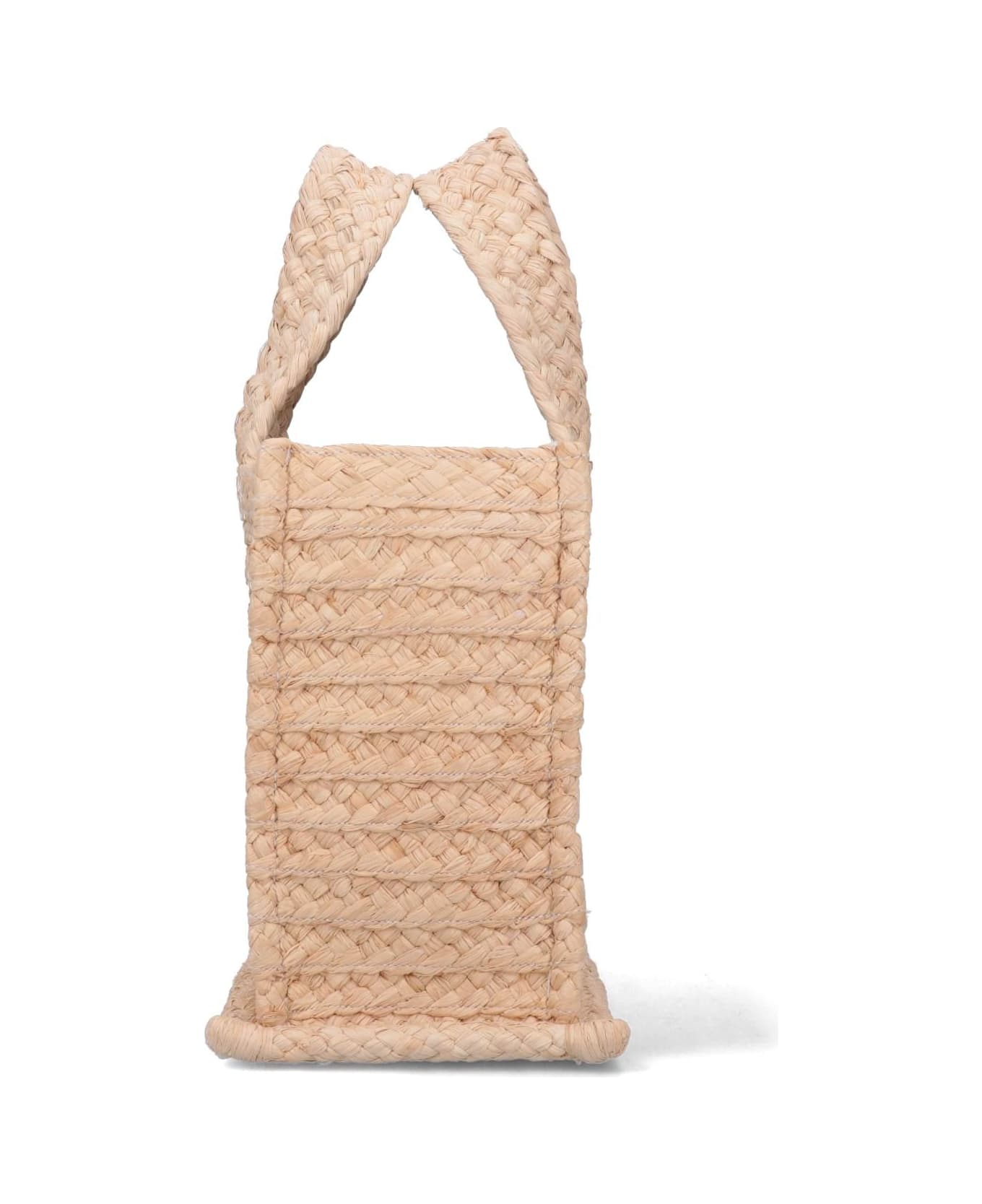 Beige mini raffia patou tote bag, with two top handles, a removable black fabric shoulder strap, black logo detail at the front, and a single inner compartment.