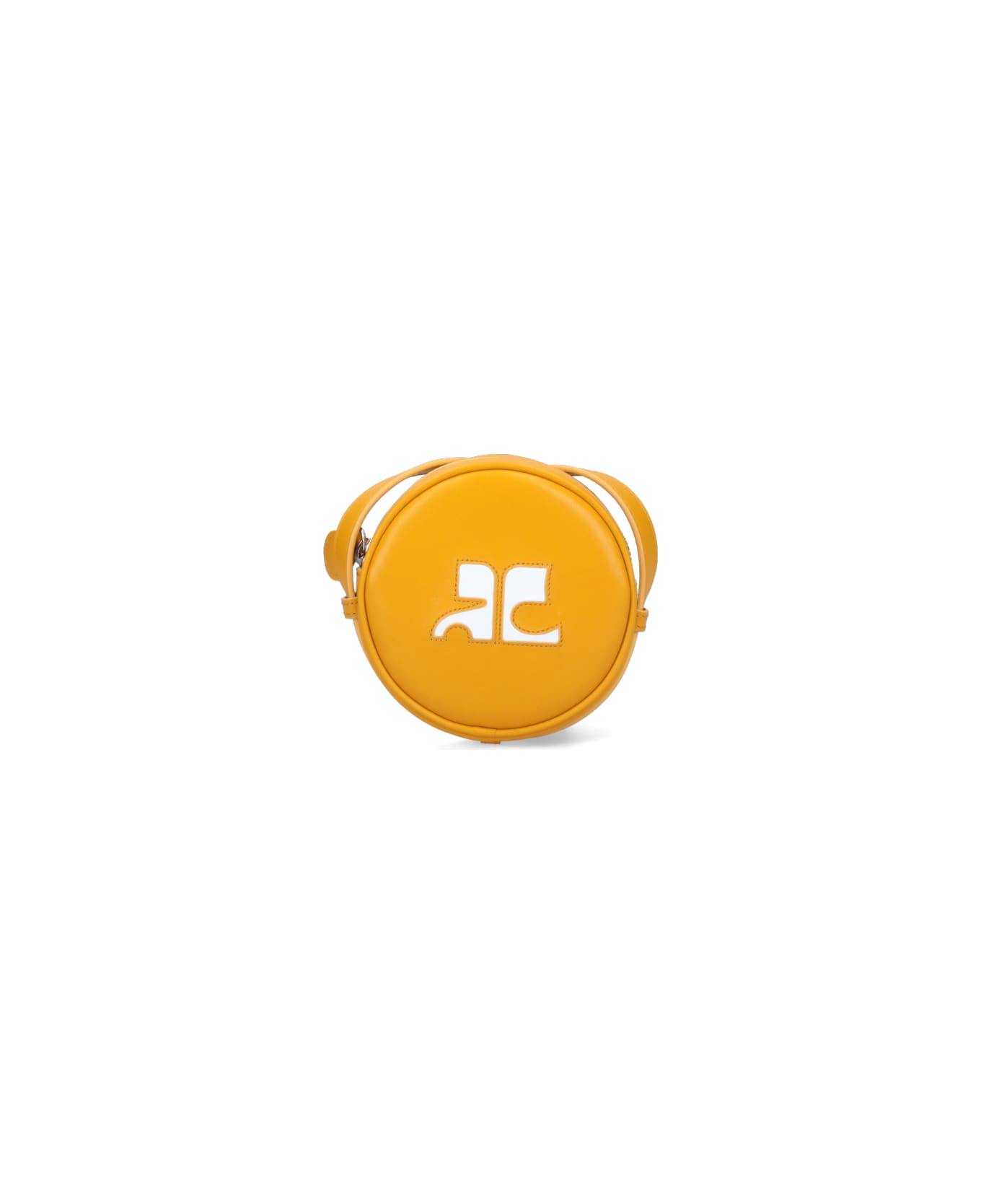 Courrèges yellow leather mini Reedition Circle bag with adjustable shoulder strap, white logo on the front, single inner compartment.