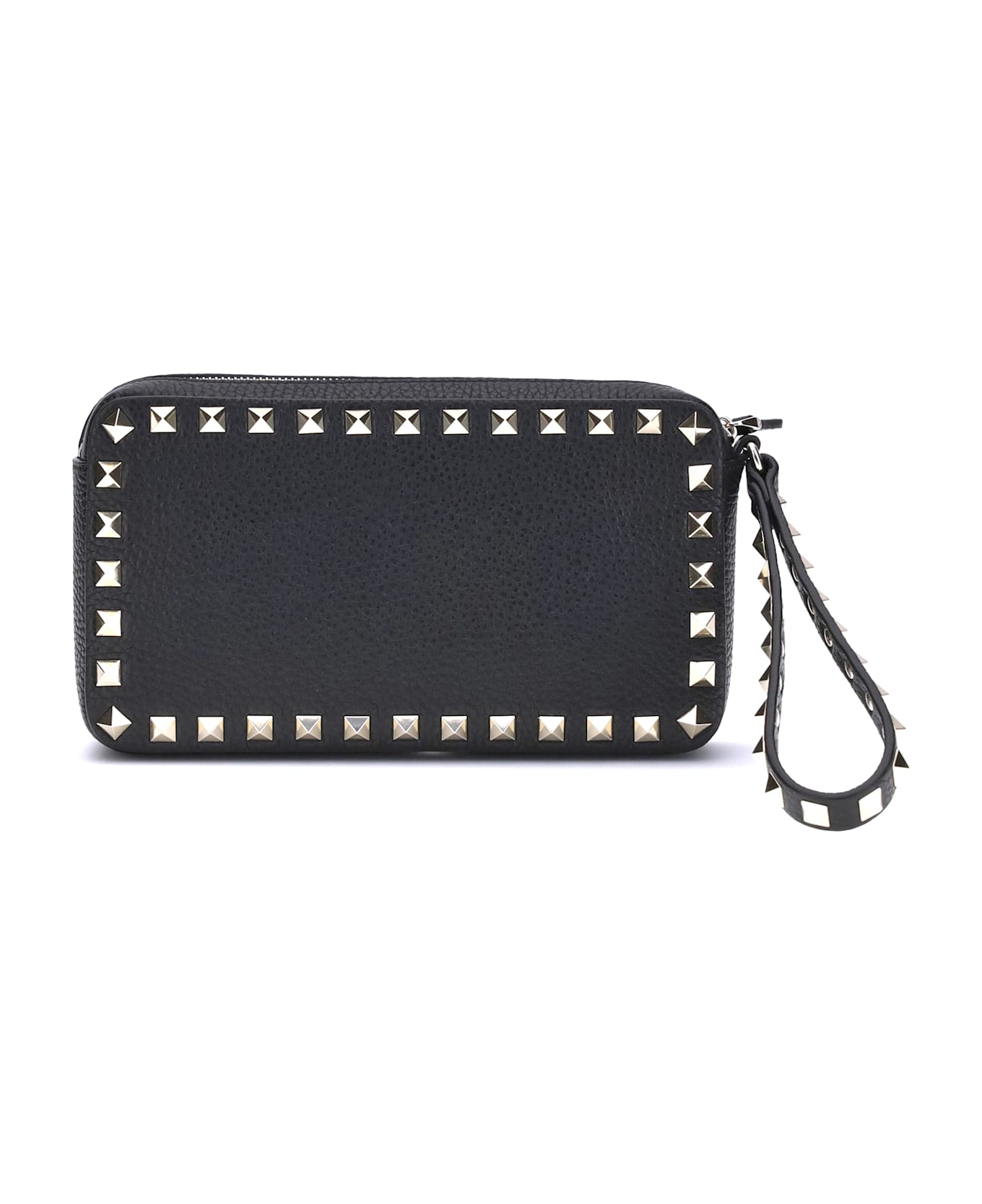 Valentino garavani leather rockstud pouch with top zipper closure for security and practicality. it features the iconic rockstud studs applied around the perimeter of the front and back panels for a distinctive, gritty design. inside, a single large compartment to organize essentials in style. Composition: 100% % Calf Leather Bos Taurus