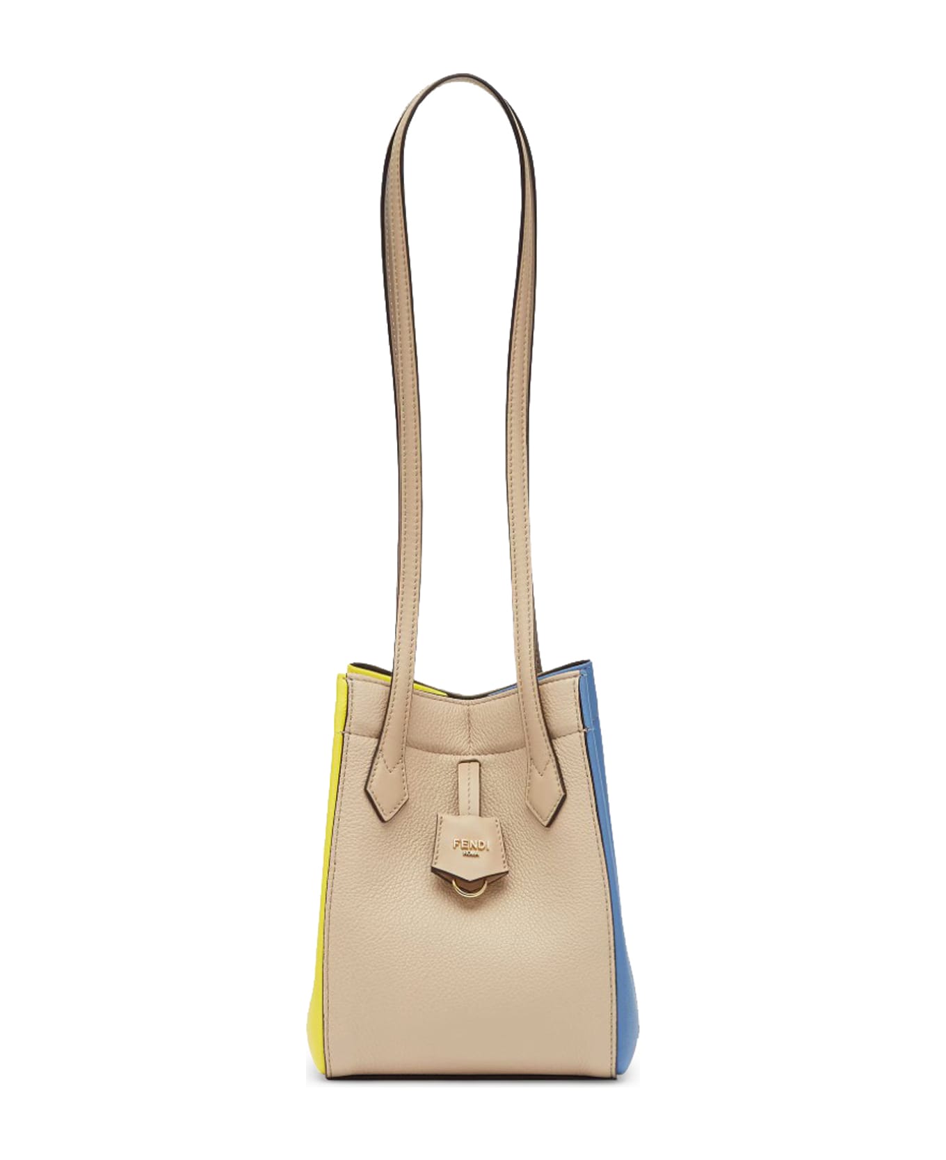 -Mini size Origami bag, made of leather with contrasting panels in shades of beige, light blue and yellow with a color block effect. -The model recalls the duality and creativity of Fendi with an innovative and transformable design: its ingenious closure with 8 magnets allows the bag to be folded like an origami, transforming it from a bucket, when the magnets join in the center with a "clasp" magic, to a shopper, by gently pulling the leather ties on the short shoulder straps on each side. -Equipped with a key ring pendant with metal Fendi writing. Lined internal compartment and metal accessories with gold finish. -It can be carried by hand or on the shoulder thanks to the 2 leather handles. -Height: 18. 5 cm -Depth: 15 cm -Width: 15 cm -Weight: 0. 39 kg
