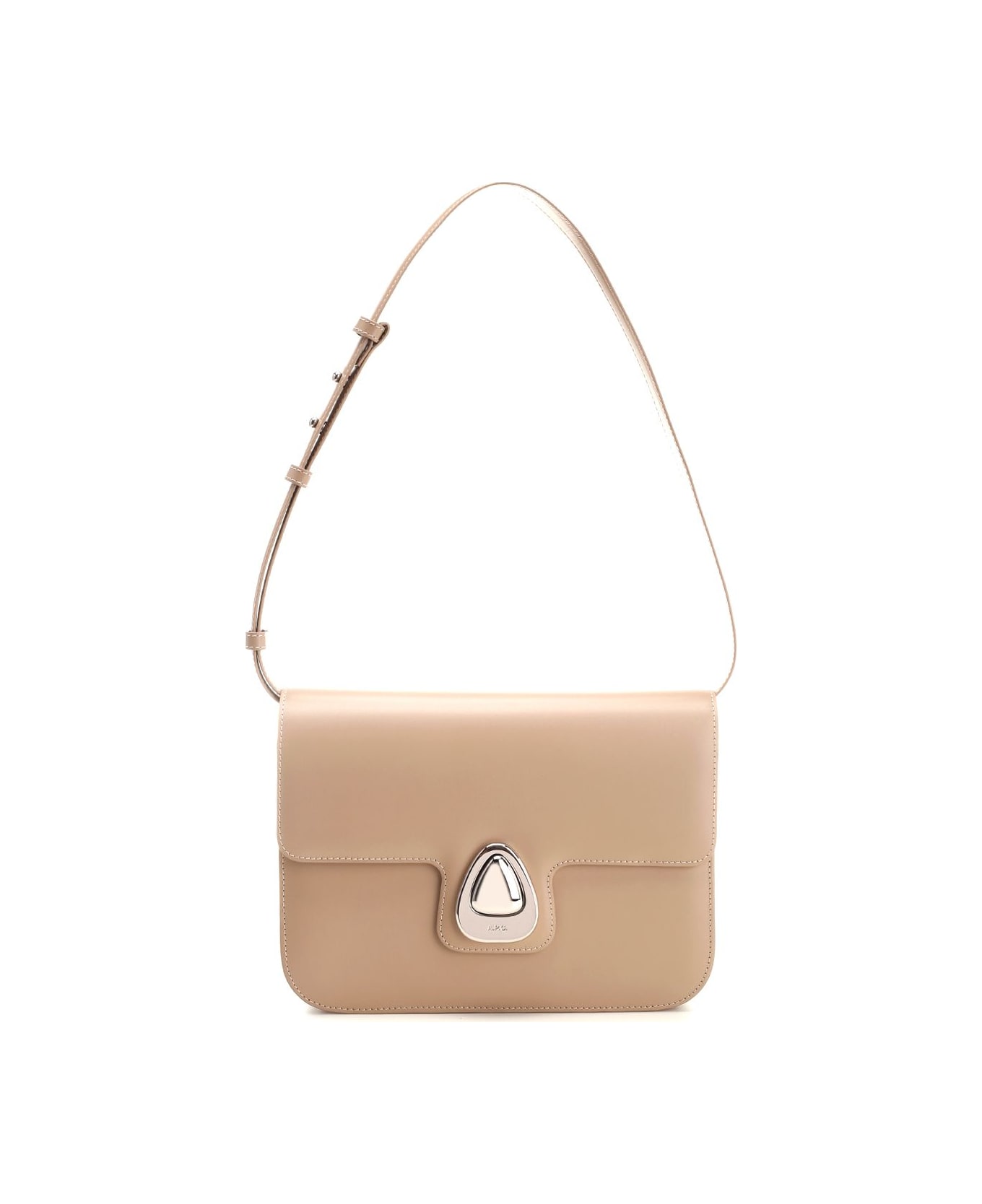 "Astra" shoulder bag in smooth nude beige leather from A. P. C. , with silver-tone magnetic jewel closure, adjustable leather shoulder strap, flap lined in suede split leather, two compartments and one internal pocket, embossed "A. P. C. " logo on the closure.