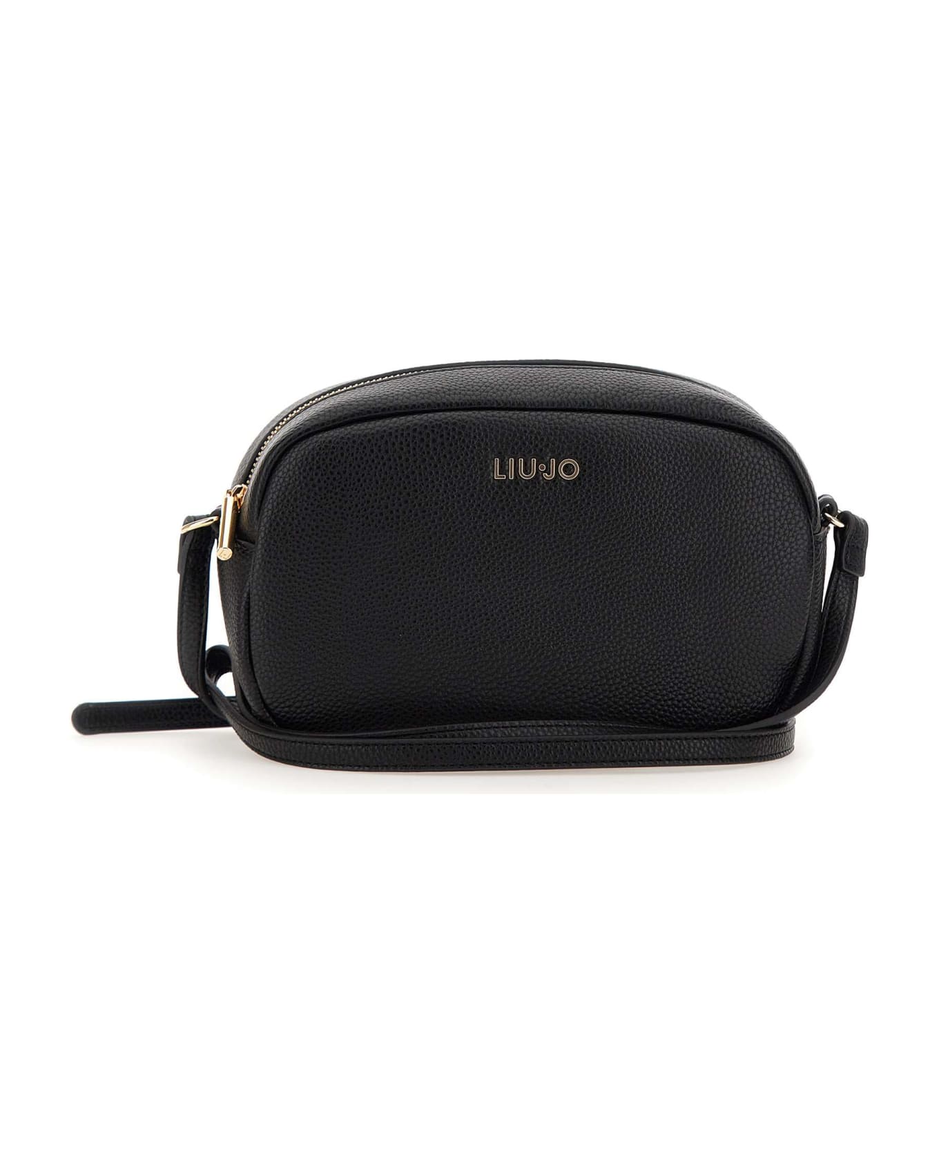 Shoulder bag Liu-Jo "Caliwen", black, ecosustainable in Pu, drummed effect, adjustable shoulder strap 90cm, gold hardware, front metal logo, inside pockets, central fastening with zip, gold hardware, external slip pocket. Measurements: length 23cm, depth 7cm, height 15cm.