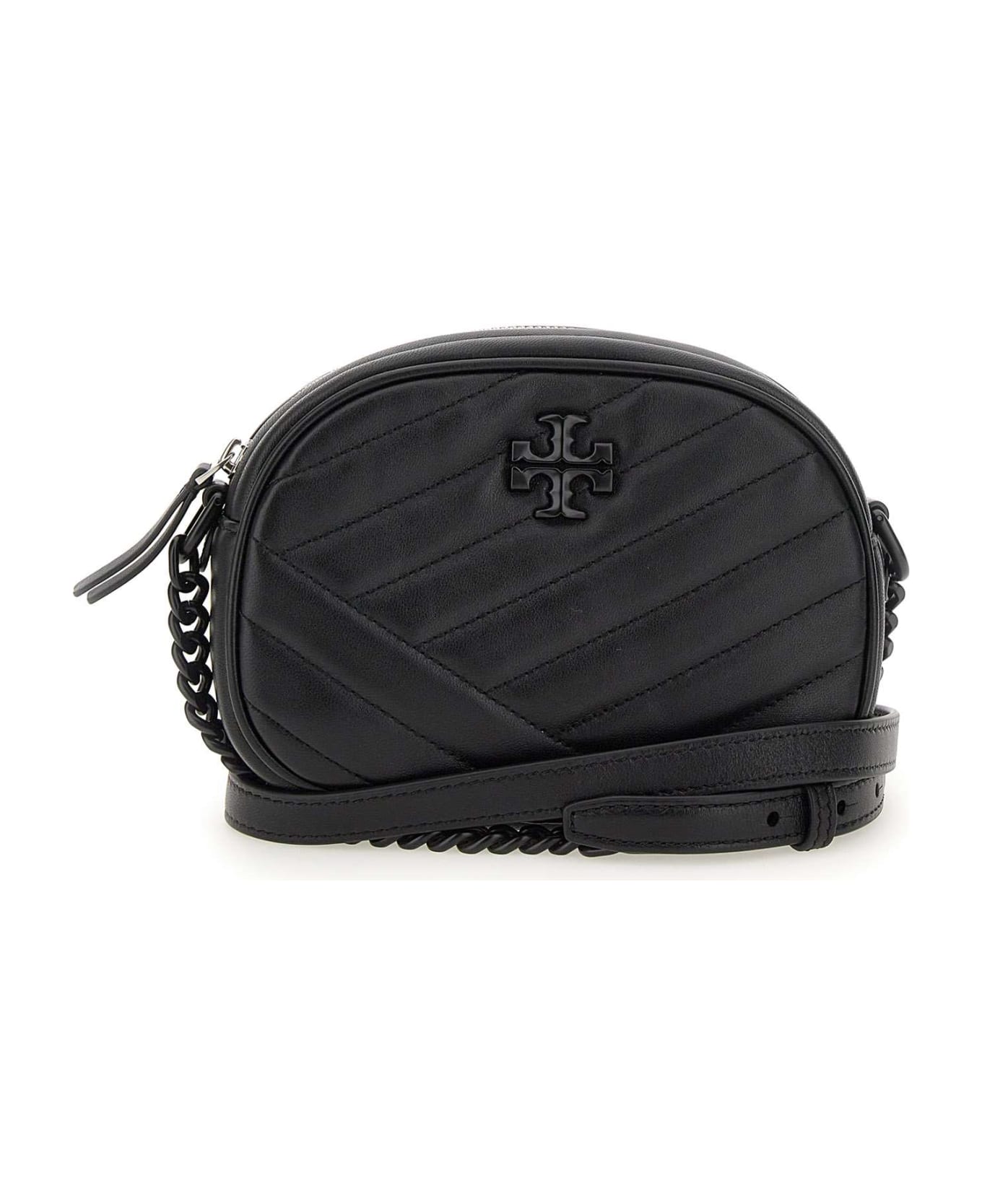 Tory Burch "Kira Chevron Powder Small Camera Bag" leather shoulder bag, black, oblique quilting, top zip fastening, iconic double T logo embossed on front, three inner pockets one of which with zip, leather shoulder strap and chain, matching metallic finishes. Dimensions: length 18cm, height 12cm, depth 6cm. Shoulder length 117cm.