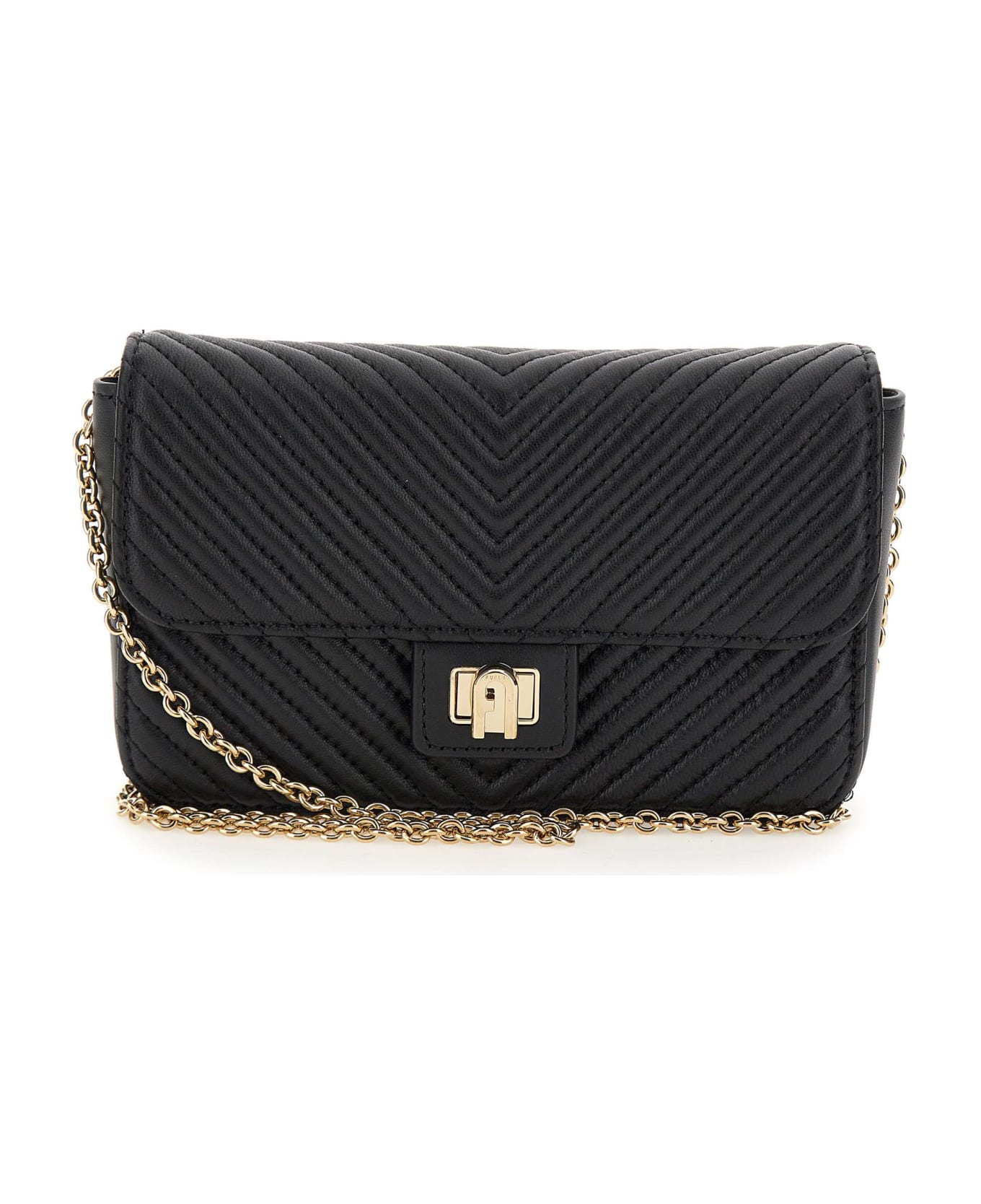 Furla leather shoulder bag "Pop Star Mini", black, crossbody model, in soft quilted nappa leather, chain shoulder strap, front flap fastening and swivel mechanism with iconic Arco logo,internal slip pocket, gold-plated finishes. Dimensions: length 19cm, height 12cm, depth 4cm. Shoulder strap length 115cm.