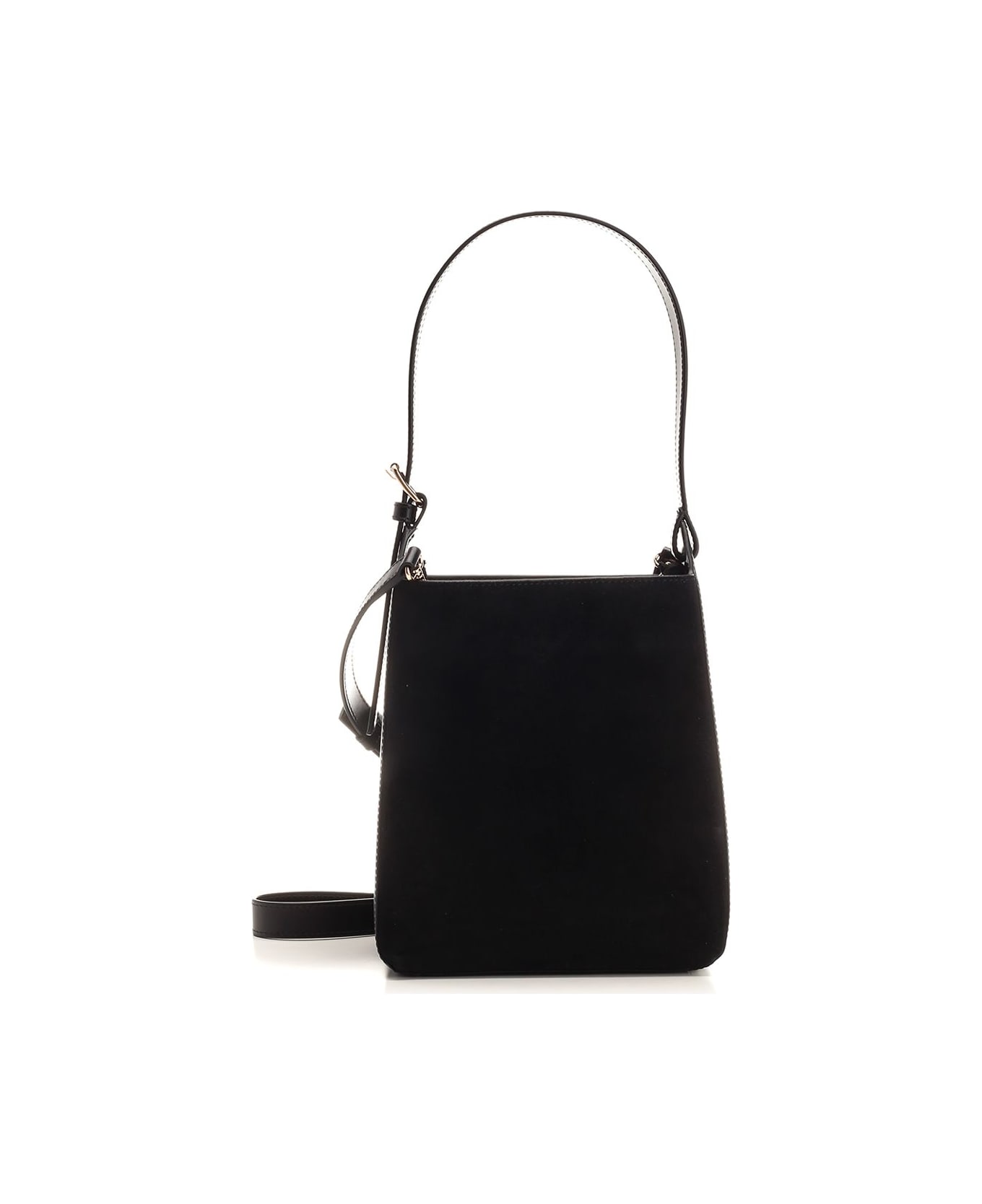 "Virginie" bag in black smooth leather and corduroy suede from A. P. C. , with adjustable leather shoulder strap, Goldtone hardware, gold-tone A. P. C. logo embossed on small inside pocket and gold-tone "A. P. C. Rue Madame Paris" logo embossed.