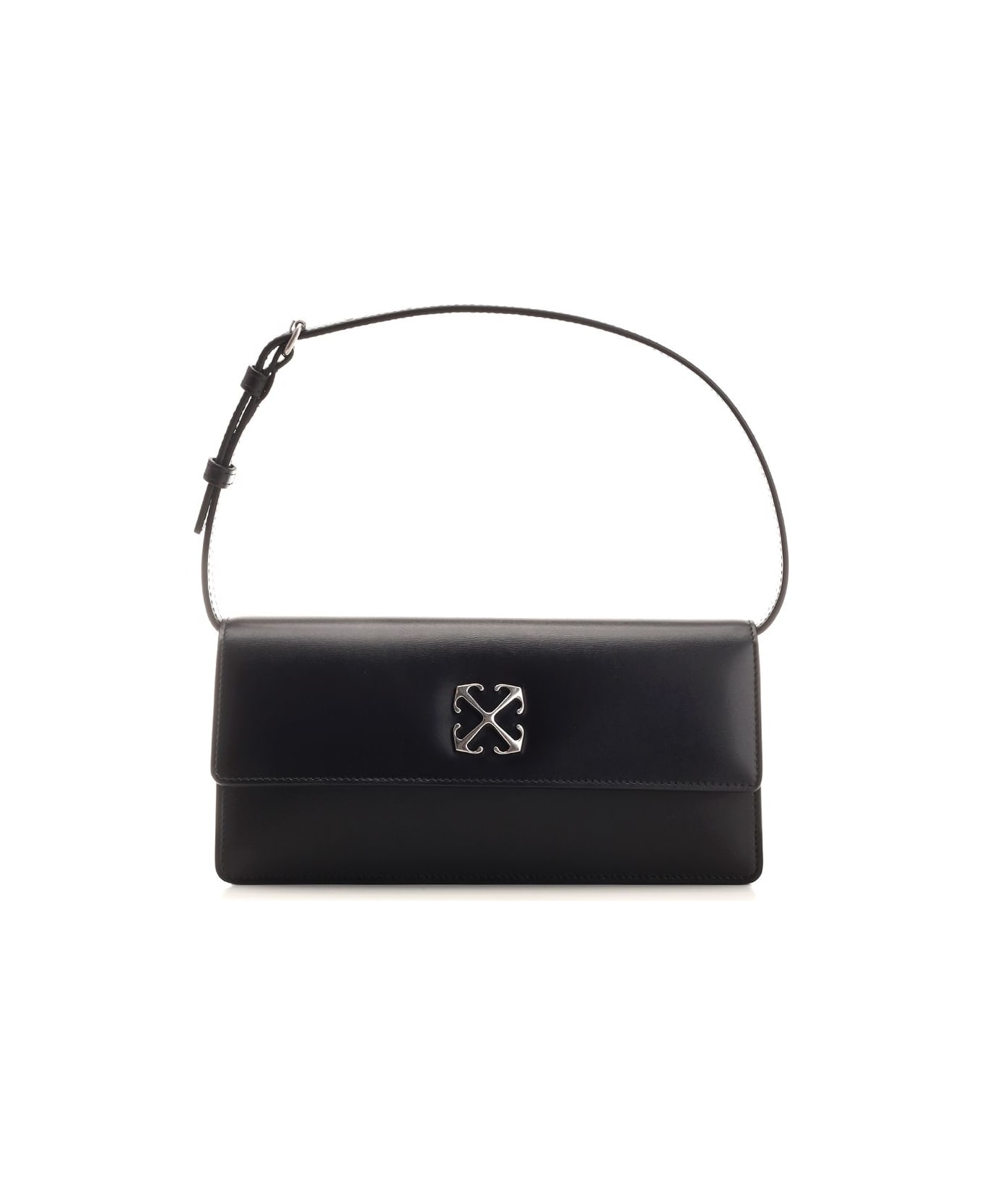 "1. 0 Jitney" shoulder bag from Off-White in black leather, metallic logo applied in the flap, removable shoulder strap, foldable flap with magnetic closure, back pocket.