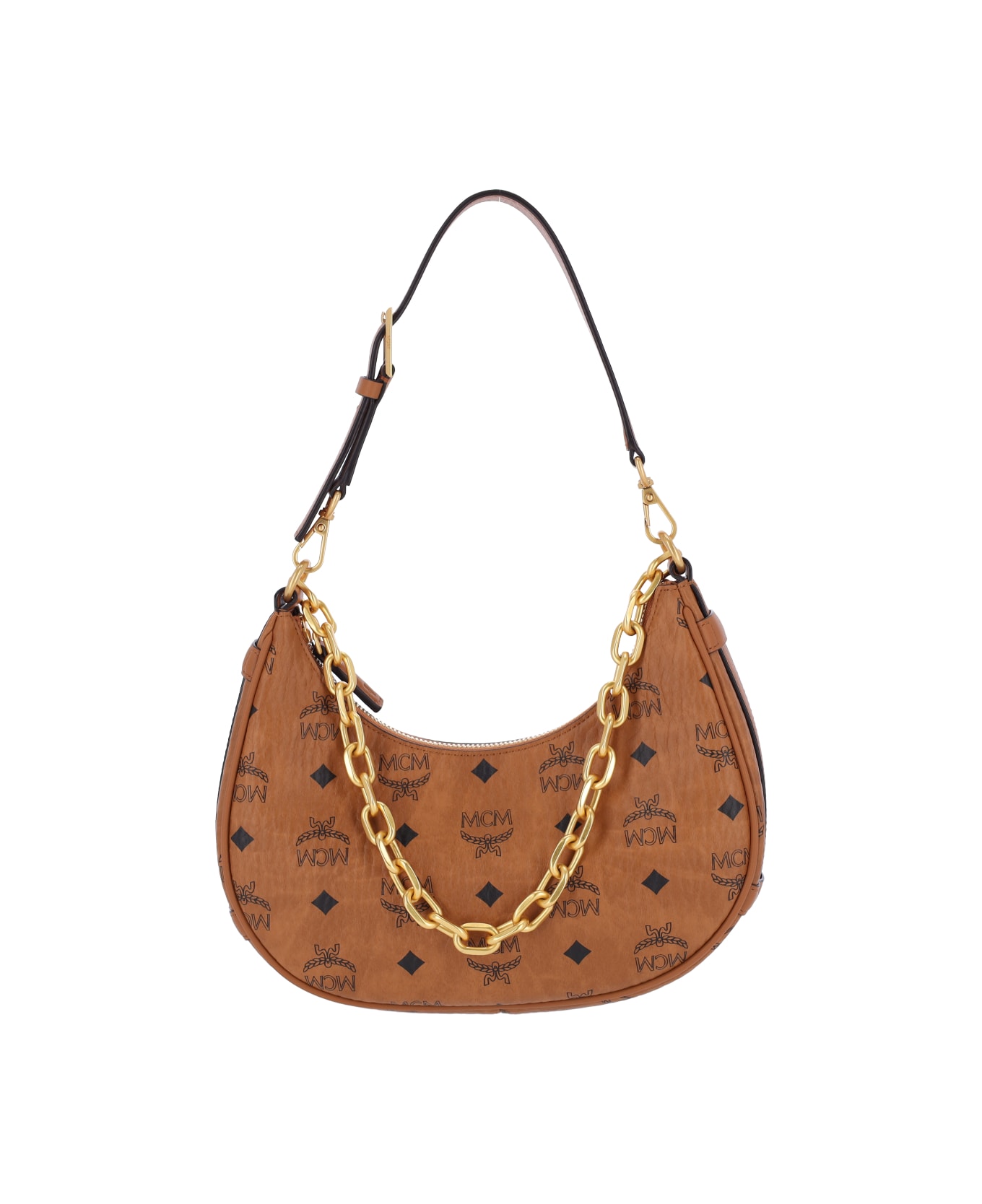 MCM Aren Crescent hobo bag made of brown monogram "Visetos" fabric with adjustable and removable shoulder strap, metal handle, zip closure, inner flat pocket, main inner compartment.