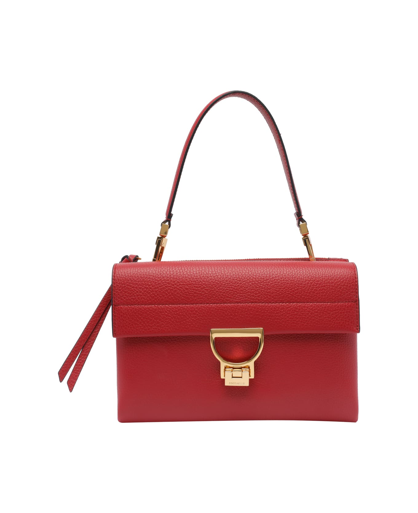 Coccinelle red Arlettis handbag, zip and turn lock closure, 3 sections, removable and adaptable strap, removable handle, leather model