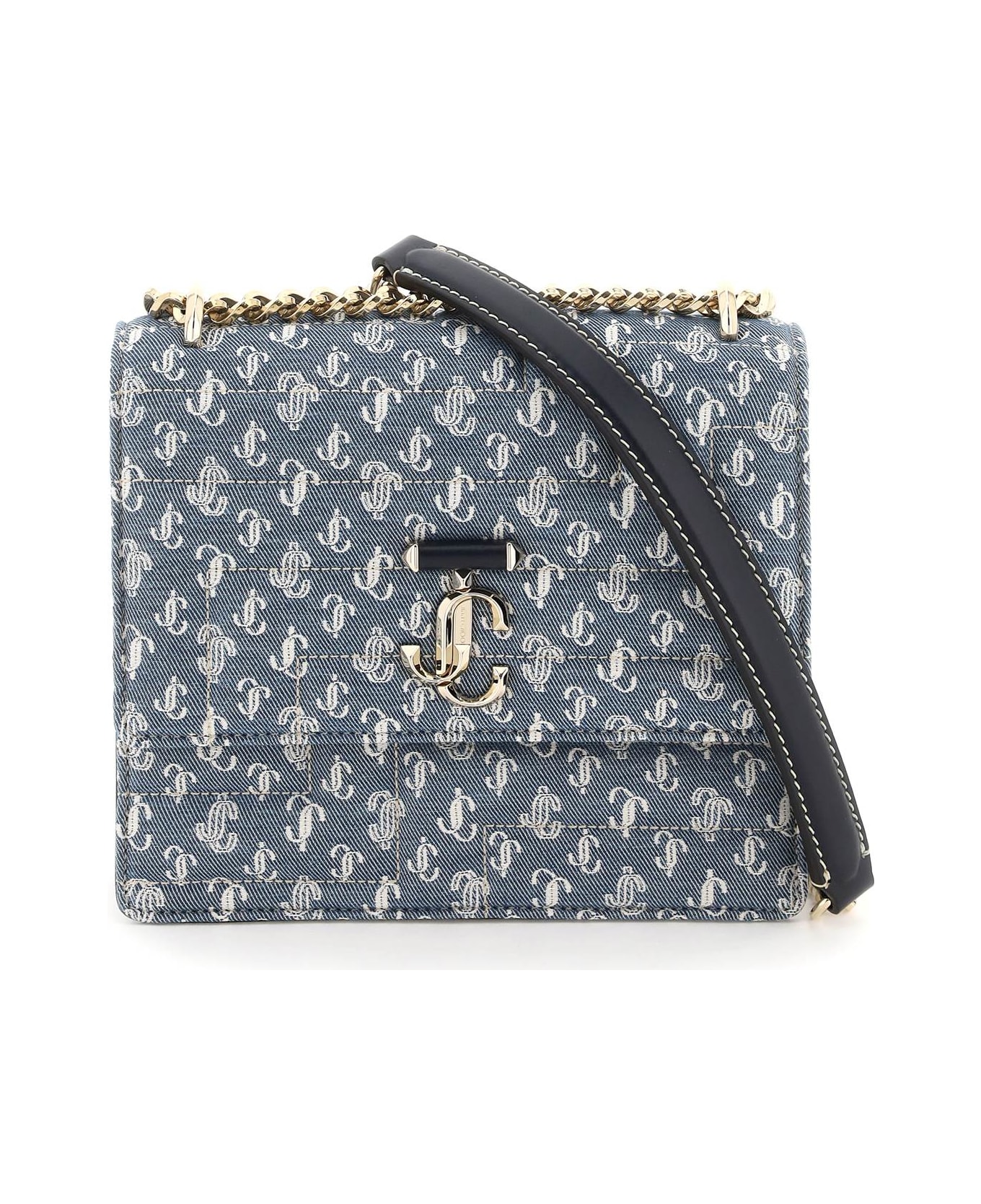 Denim matelasse bag by Jimmy Choo with metallic JC logo applique on flap and JC contrasting monogram all-over. Press button closure, suede interior with a credit card slot. Sliding chain shoulder strap with a leather insert. Gold-finish metalware.
