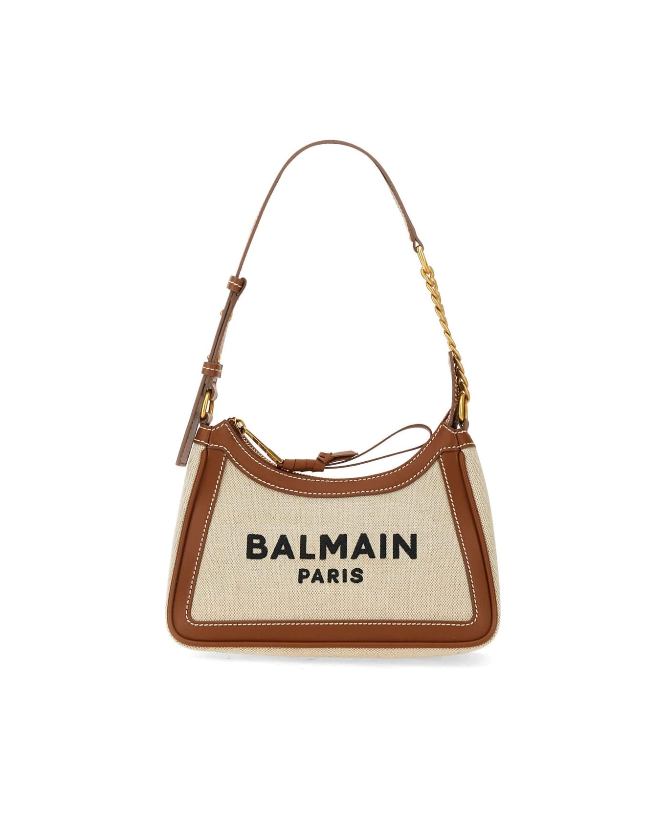 Balmain 'B-Army' shoulder bag in cream cotton canvas with beige leather details, adjustable top shoulder strap, gold chain detail, black logo embroidery on the front, zip closure, main inner compartment, inner slip pocket.