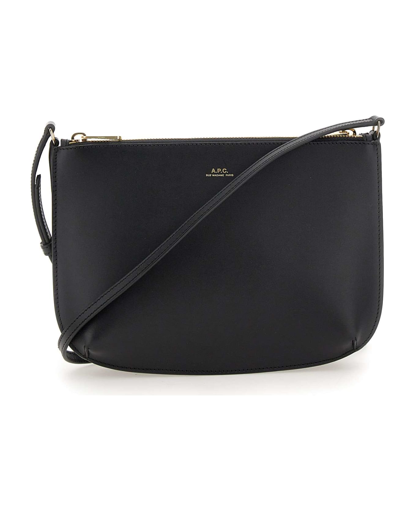 Smooth calfskin shoulder bag A. P. C. "Sarah", black, two compartments with gold zip fastening, adjustable shoulder strap, gold-colored "APC rue Madame" logo embossed on front, convex and rounded lower corners, cotton lining, inside pocket and applied logo patch. Dimensions: 25 x 18 x 5cm.