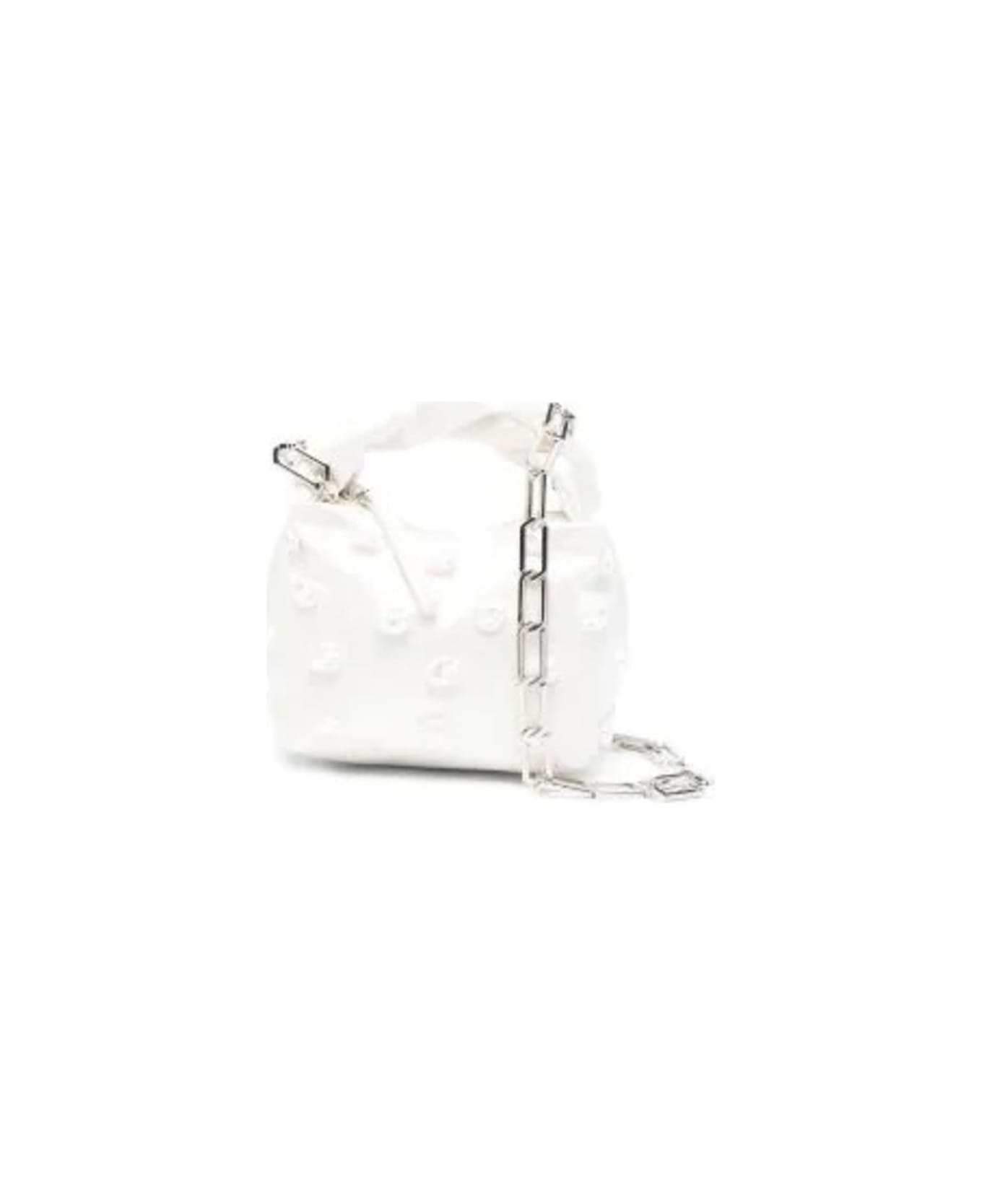ivory white satin weave faux-pearl embellishment single top handle chain-link shoulder strap main compartment internal slip pocket internal logo embroidery full lining silver-tone hardware top zip fastening This piece comes complete with a protective dust bag.
