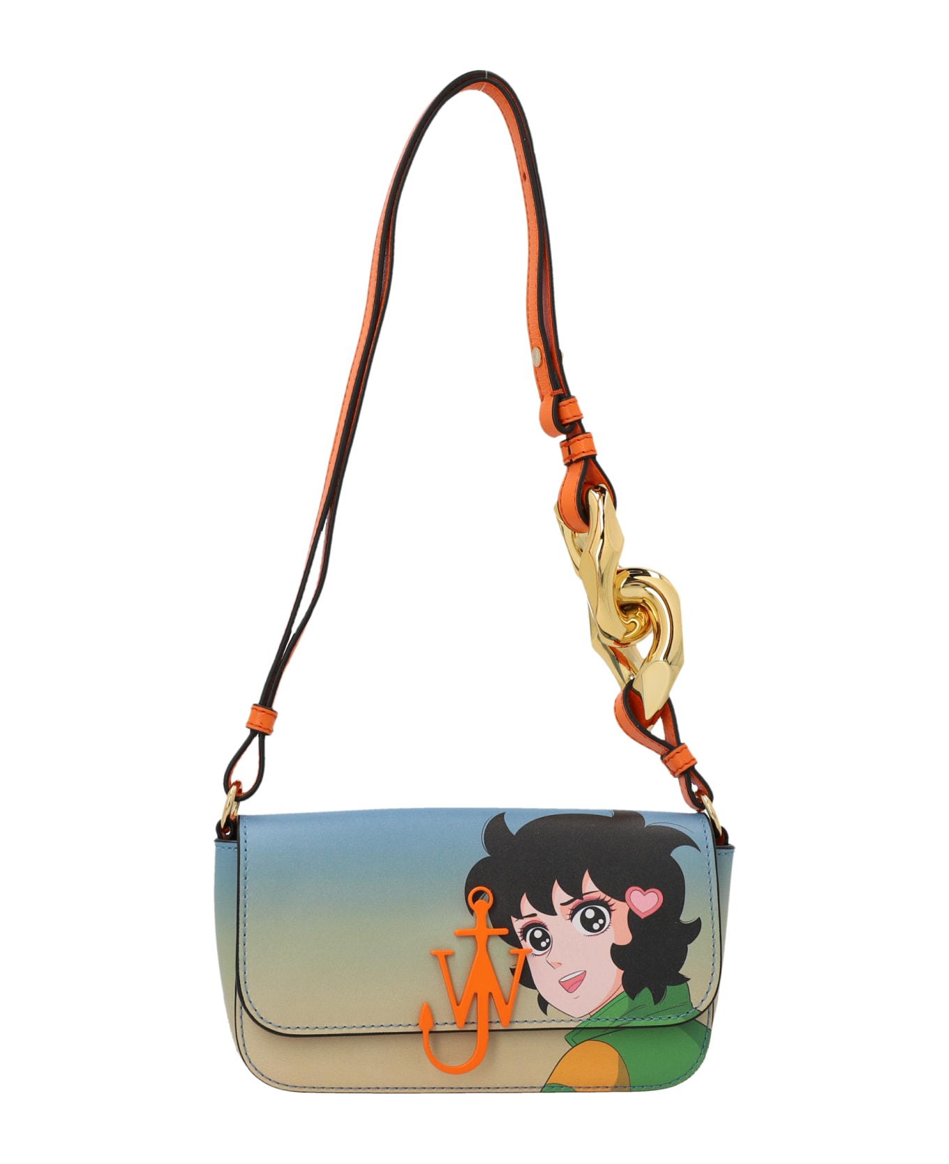 'Baguette Anchor' x Run Hany leather shoulder bag with a front print, a two-ring chain, a flap with a magnetic closure, a logo anchor with an enamel finish, an adjustable shoulder strap, an inner leather pocket, and a suede lining.
