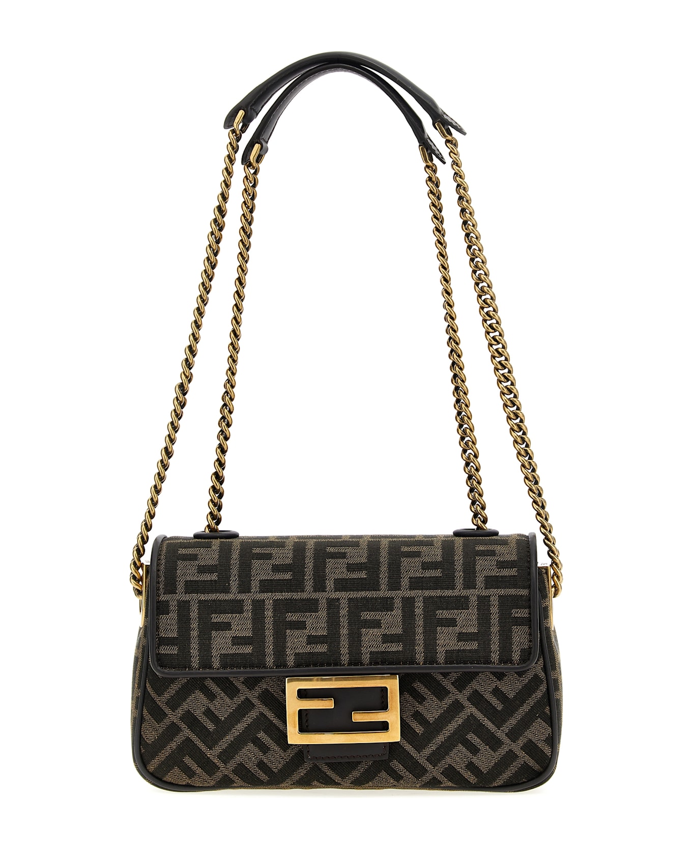 Baguette Chain Midi shoulder bag in jacquard fabric with iconic FF pattern, leather details, magnetic flap closure with metal logo appliqué, fixed handle, sliding chain shoulder strap.