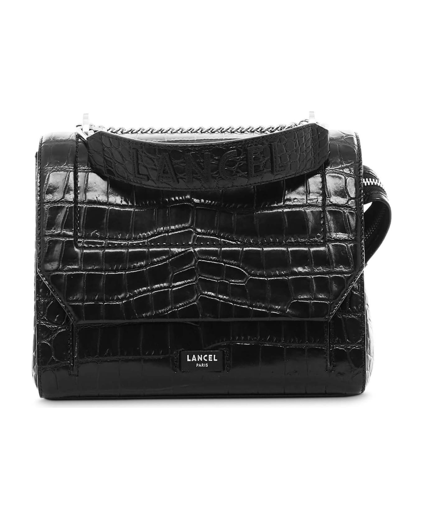 Black cowhide leather shoulder bag with shiny crocodile style, textile lining, chain and leather shoulder strap, one outside patch pocket on the back, one outer zipped pocket under the flap, one inner patch pocket, one inner zipped pocket, 22,5 x 18 x 11,5 cm