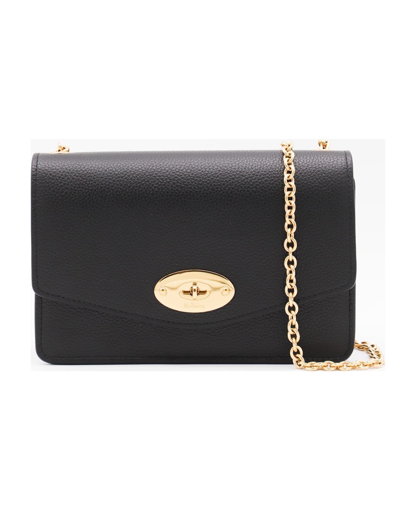 Black leather Small Darley Classic Grain crossbody bag from Mulberry featuring removable chain strap, gold-tone metal hardware, twist-lock closure, main compartment, internal zip compartment and card slots.