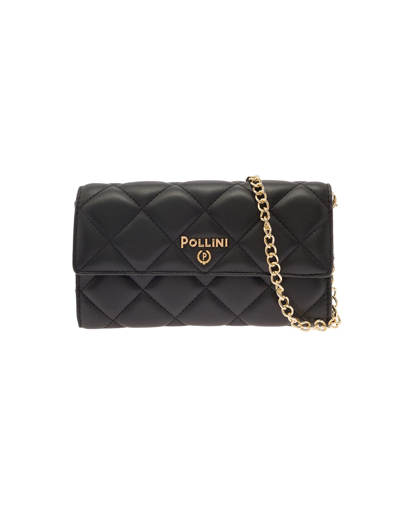 Wallet on chain Foldover top Front logo Chain link strap Quilted design Note compartment Card slots Black Leather Dimensions: 20x11x3cm