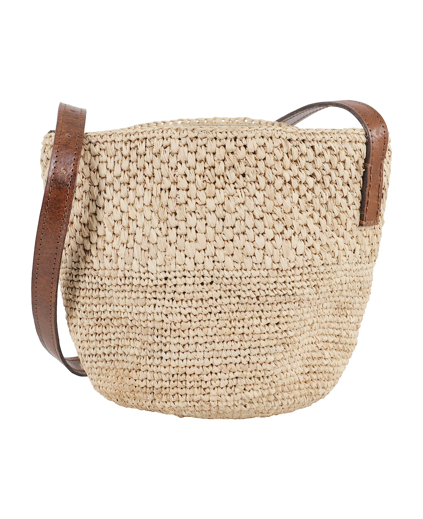 Maika bag - Ibeliv - Tea color - Made of natural raffia - Single compartment - Bucket design - Leather shoulder strap - Inside drawstring closure - Size: 16 x 18 cm.