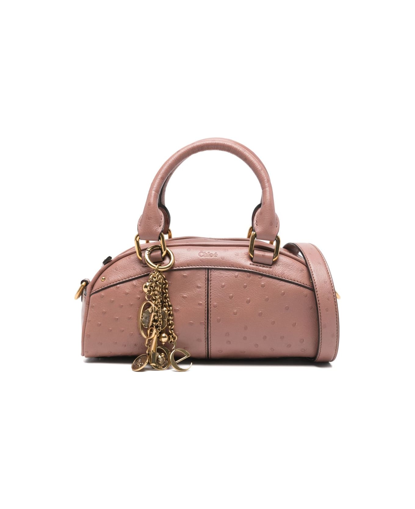 old pink dotted texture leather gold-tone hardware top handles detachable and adjustable shoulder strap charms detail This piece comes complete with a protective dust bag. Composition: 100% Leather