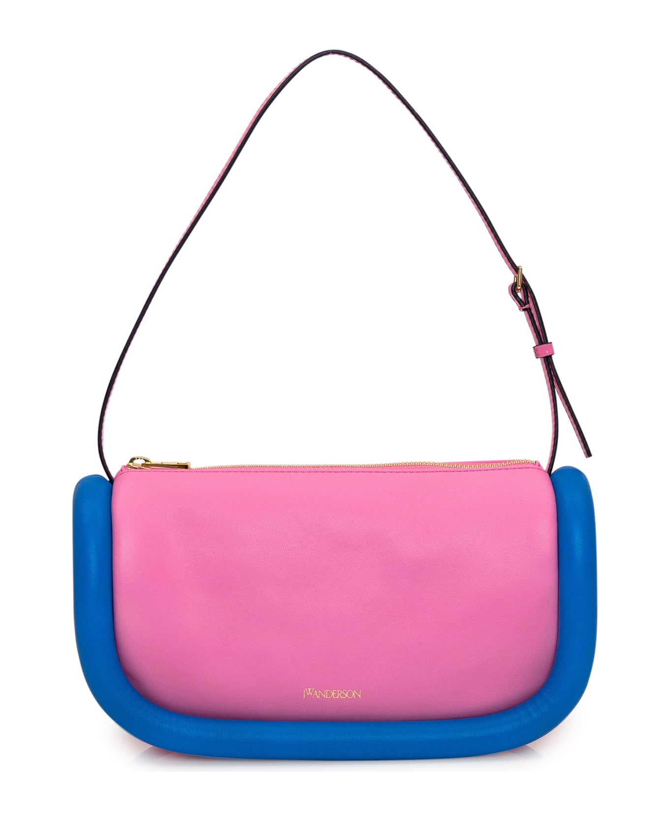 Pink bag. Adjustable handle. Zip closure. Contrasting padded edges. Logo on the front.