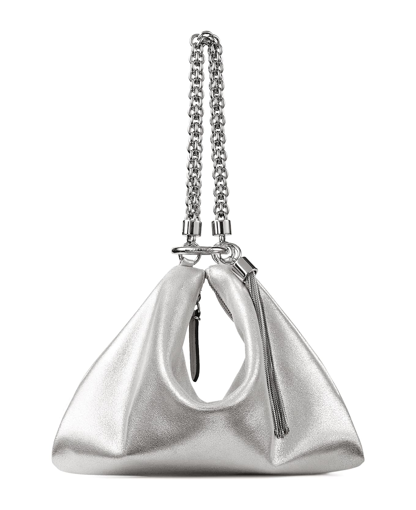 Closure with zip Chain handle Metal tassel detail Made in Italy Leather Lining: satin W: 25 cm x H: 18 cm x D: 4 cm SKU: CALLIEMEASILVER