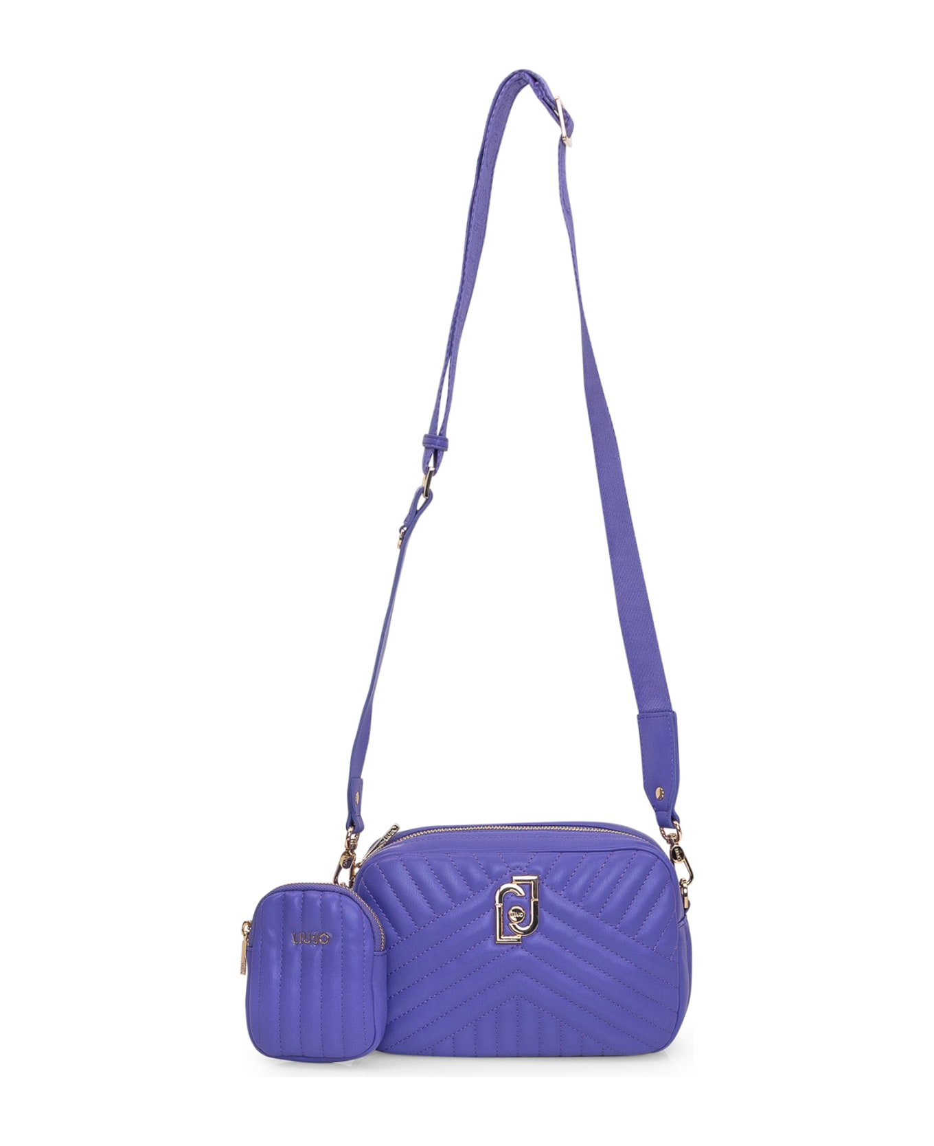 Purple bag. Adjustable shoulder strap. Zip closure. Logo on the front. Removable clutch bag.