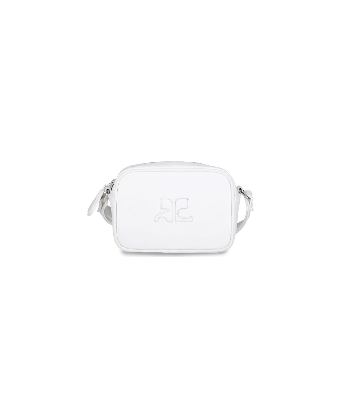 Courrèges 'Camera Reedition' crossbody bag in white leather with adjustable shoulder strap, tone-on-tone logo at the front, a zip closure, a main inner compartment.