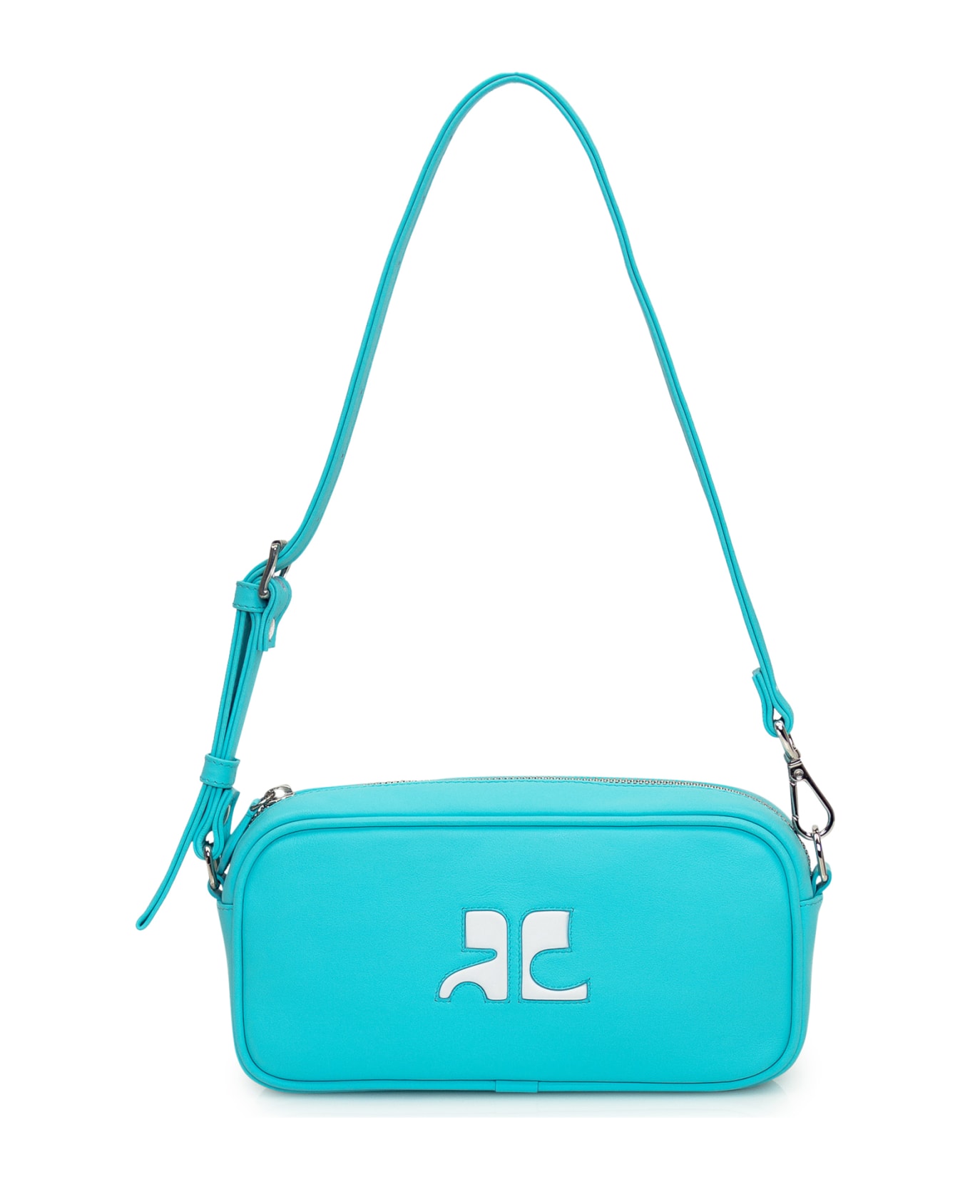 Blue shoulder bag. Adjustable shoulder strap. Zip closure. Logo on the front.