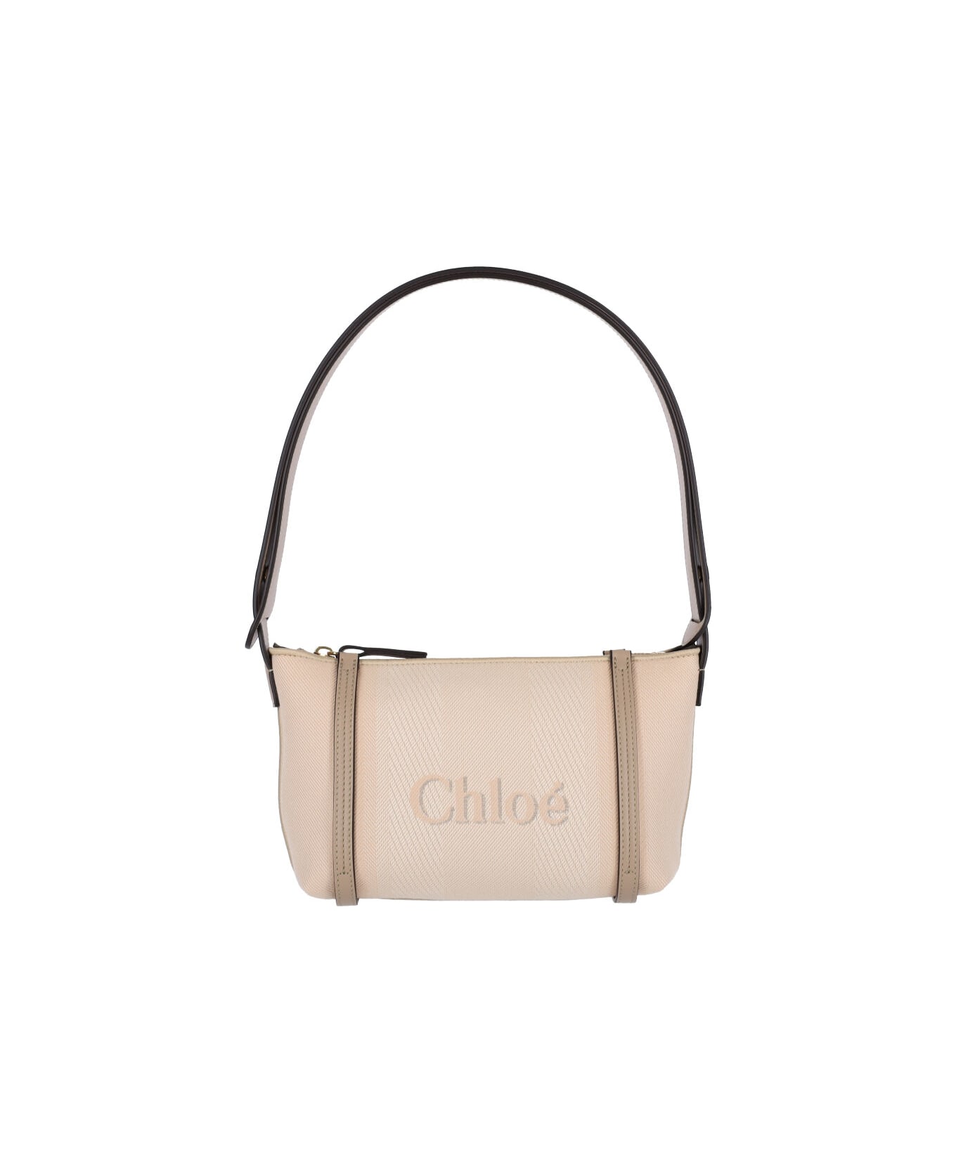 Chloé Carry shoulder bag in beige cotton with calf leather trim, adjustable handle, zip closure, front logo jacquard, inner flat pocket, main inner compartment. Composition: 91% Cotton, 6% Polyester, 3% Other Fibers