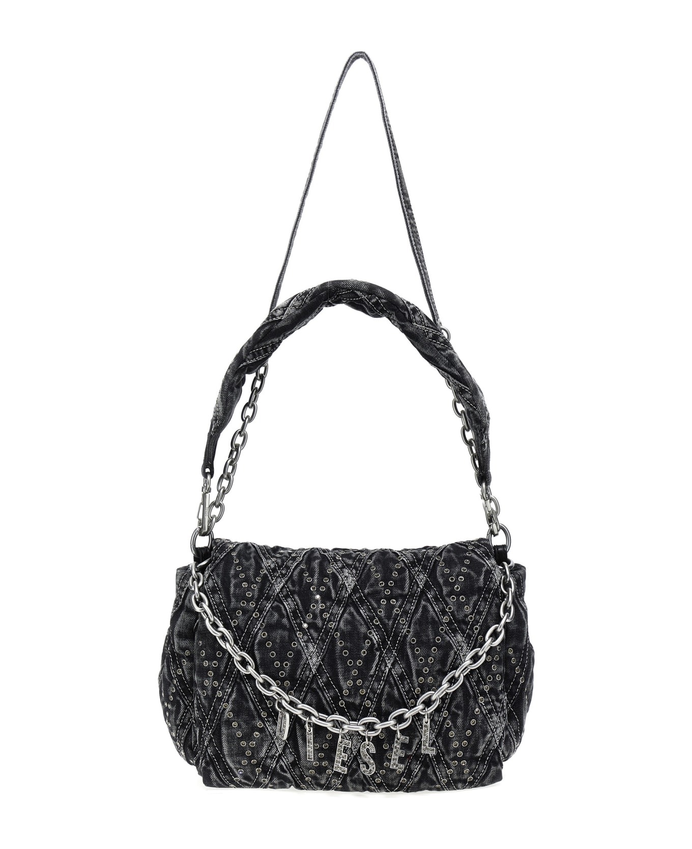 'Charm' denim shoulder bag with stud appliqué, chain detail with metal logo charm, removable denim handle, thin shoulder strap, flap closure Composition: