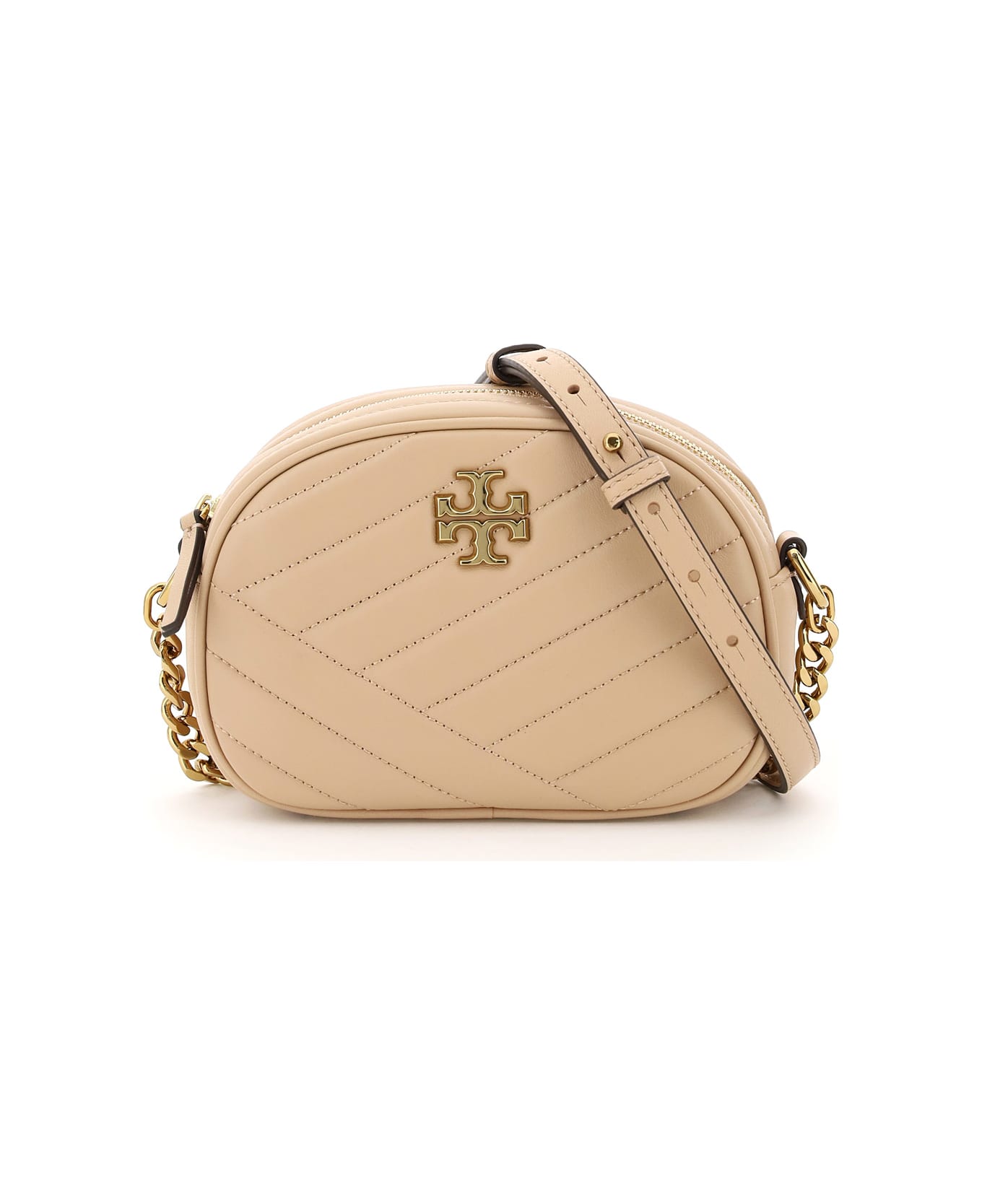 Tory Burch quilted leather camera bag with adjustable chain and leather strap. Zip closure, metallic double T logo on the front, fabric lining, inside zip pocket, two open pockets. Gold-tone hardware.
