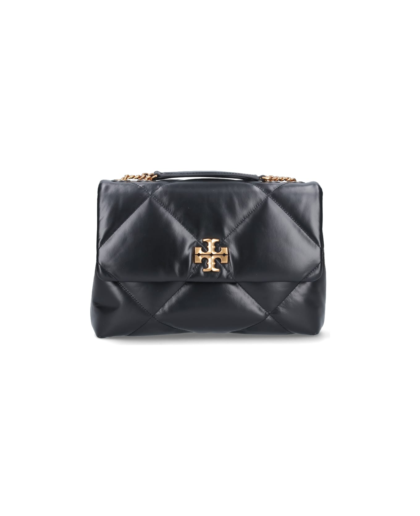 Tory Burch 'Convertibile Kira' black leather shoulder bag with quilted design, sliding chain detail handles, gold logo buckle, turn-lock closure, two inner zip pockets, one inner slip pocket, two separate compartments.