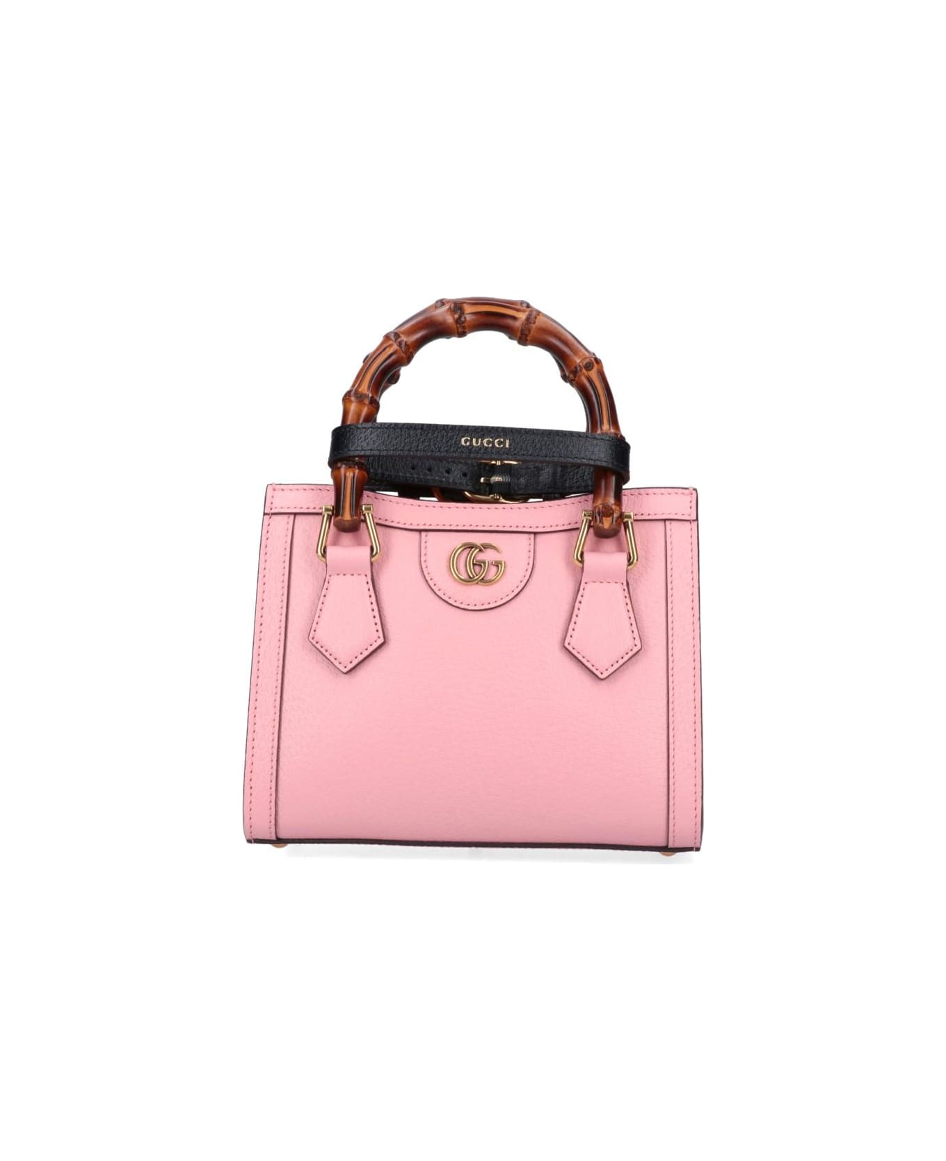 Gucci  'Diana' Mini Tote Bag, made of pink leather, two bamboo top handles, one adjustable and detachable 'web ribbon' shoulder strap, one adjustable and detachable leather shoulder strap, two decorative logo bands, golden metallic logo lettering on front, one main internal compartment.