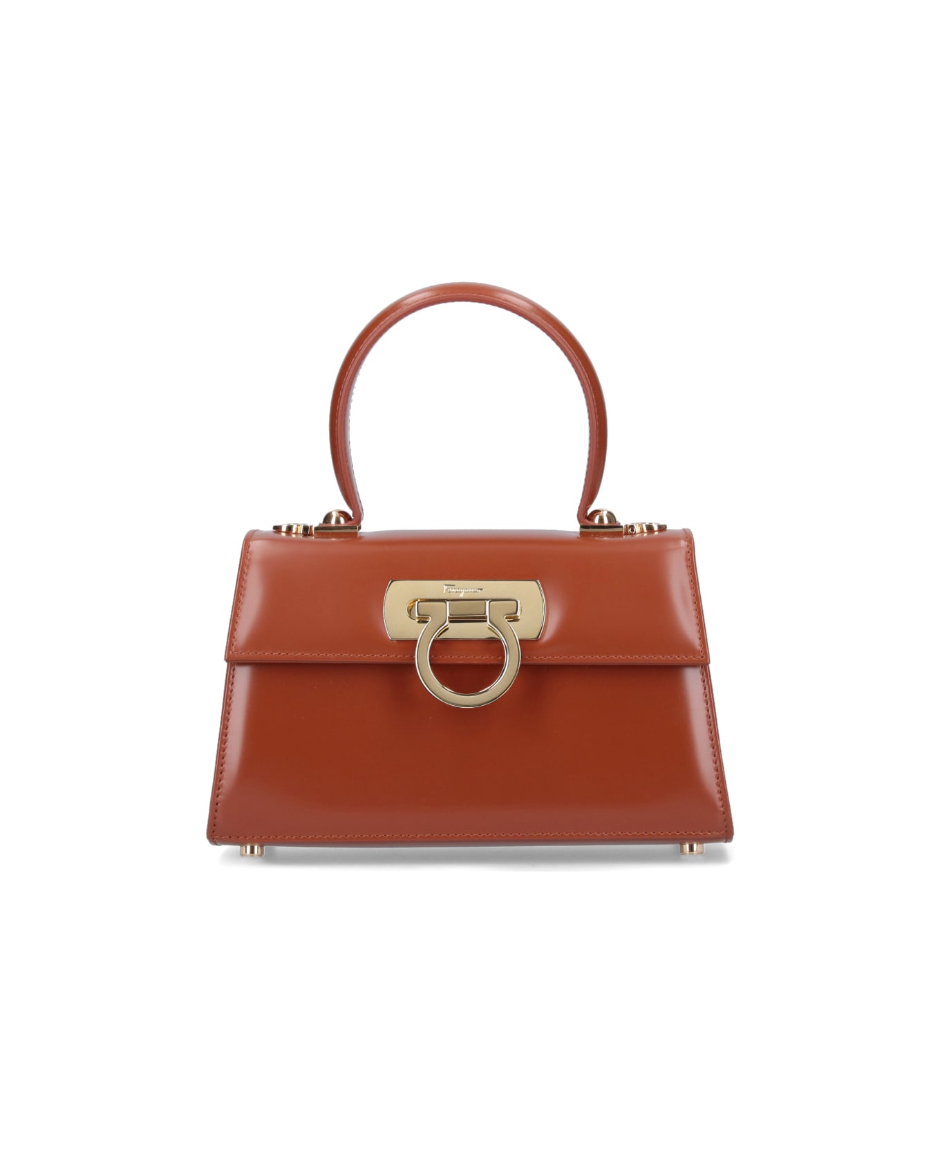 Ferragamo East-West Iconic handbag, in shiny brown leather, top handle, removable shoulder strap, golden Gancini logo buckle closure on front, flat back pocket, inside zip pocket, two separate inside compartments. Composition: 100% Calfskin
