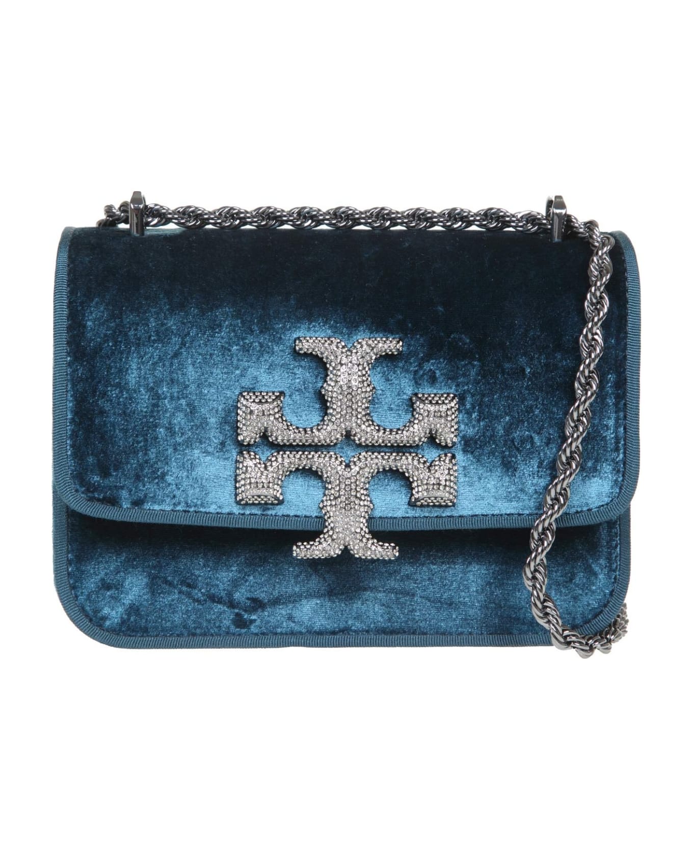 Small velvet shoulder bag blue color finishes in grosgrain magnetic flap closure shoulder strap in interwoven chain non-removable and non-adjustable shoulder strap leather finishes shiny gunmetal hardware logo with crystal pavè one inside pocket with zip two internal slit pockets measures: length 19cm height 13. 5cm depth 7cm composition velvet and leather made in china
