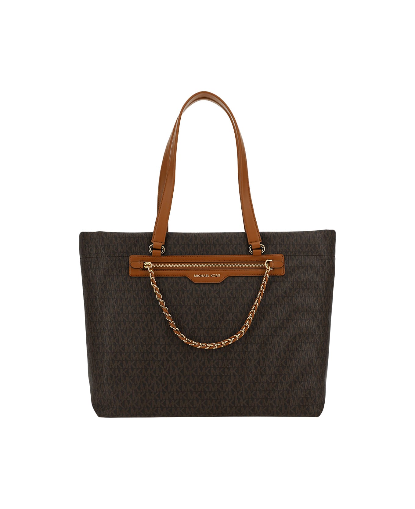 Calfskin elliot tote bag by michael kors, double flat top handles, interior zipper closure, flat zippered welt pocket on front, embossed iconic brand monogram plaque on front, single interior compartment, interior slit pockets.