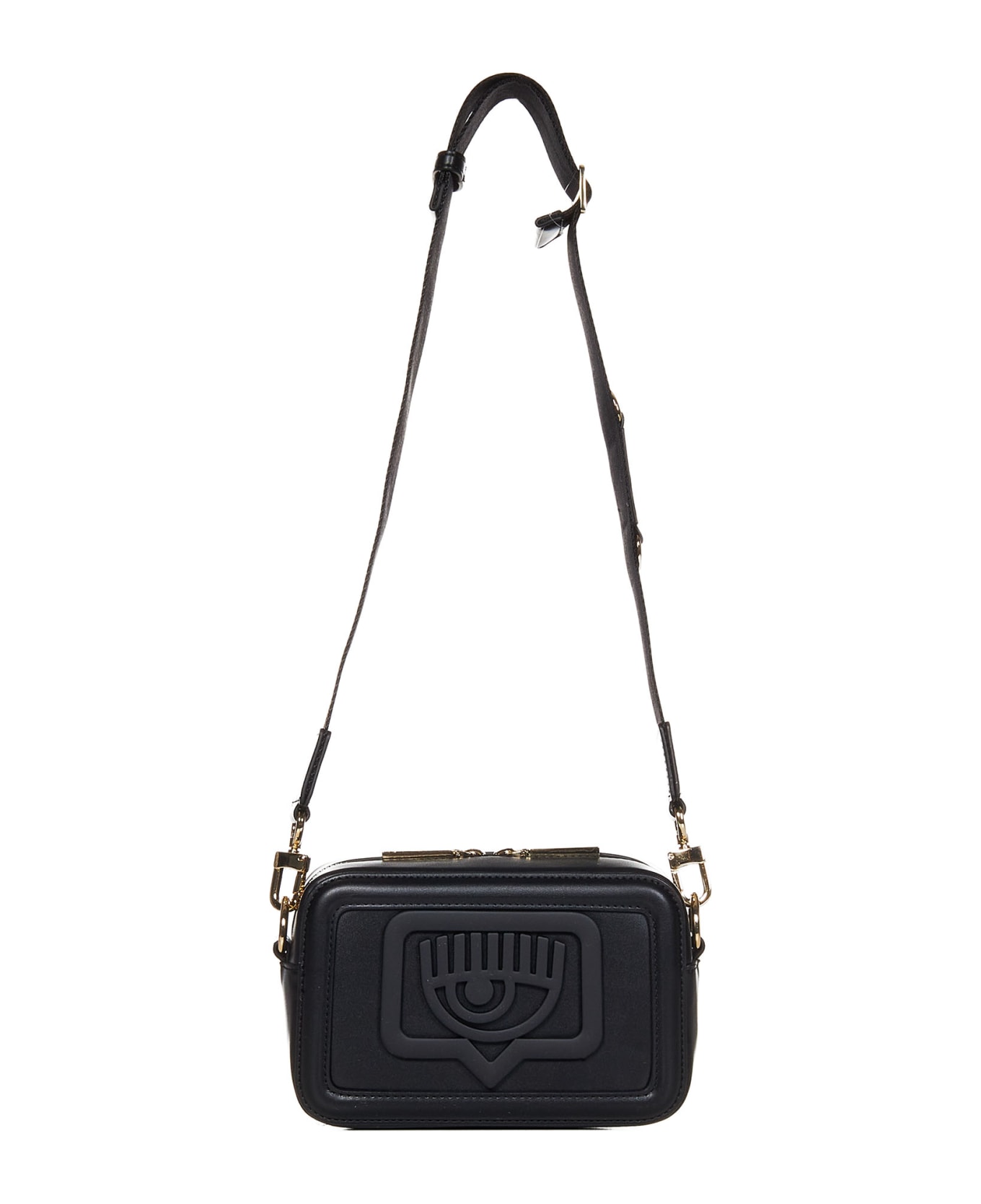 Adjustable and removable fabric shoulder strap with all-over jacquard Eyelike logo, eco-leather details and golden metal snap hooks