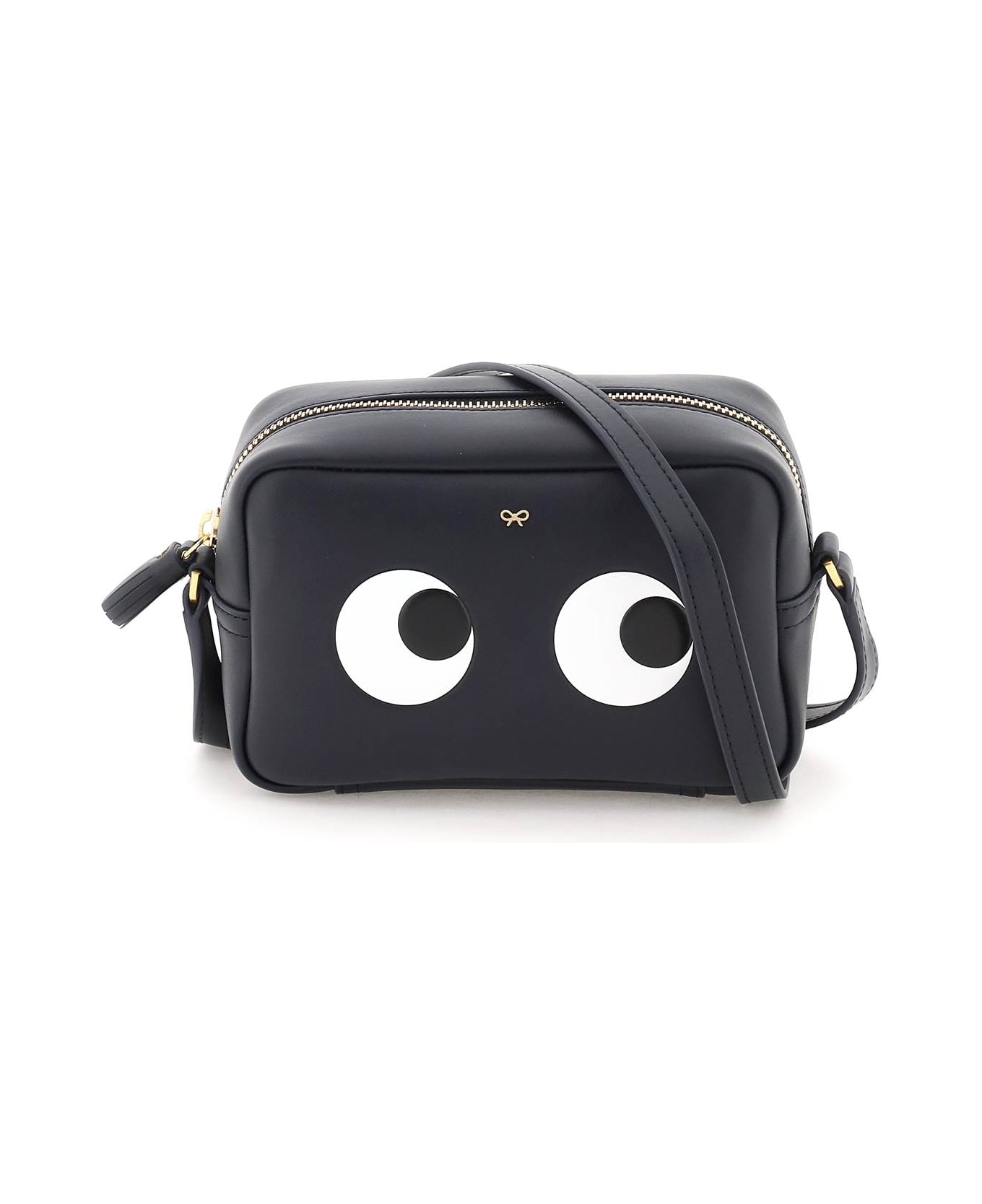 Anya Hindmarch leather camera bag with the iconic "Eyes" and gold-tone metal micro bow on front. Adjustable shoulder strap, zip closure, leather tassel zip puller, suede lining, one inner leather patch pocket, gold-tone hardware.