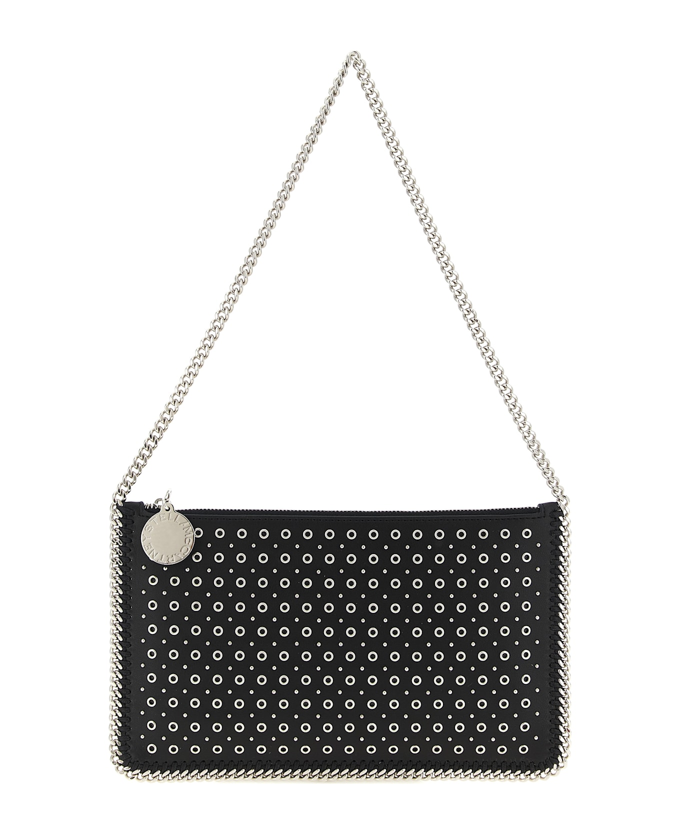 'Falabella' shoulder bag in leather-effect fabric with all-over metal studs and diamond-effect chain piping. Top zip closure, fixed chain handle, medallion charm with engraved logo. SUSTAINABLE: Products that do not use leather respecting cruelty free ethics. Composition: 100% polyester
