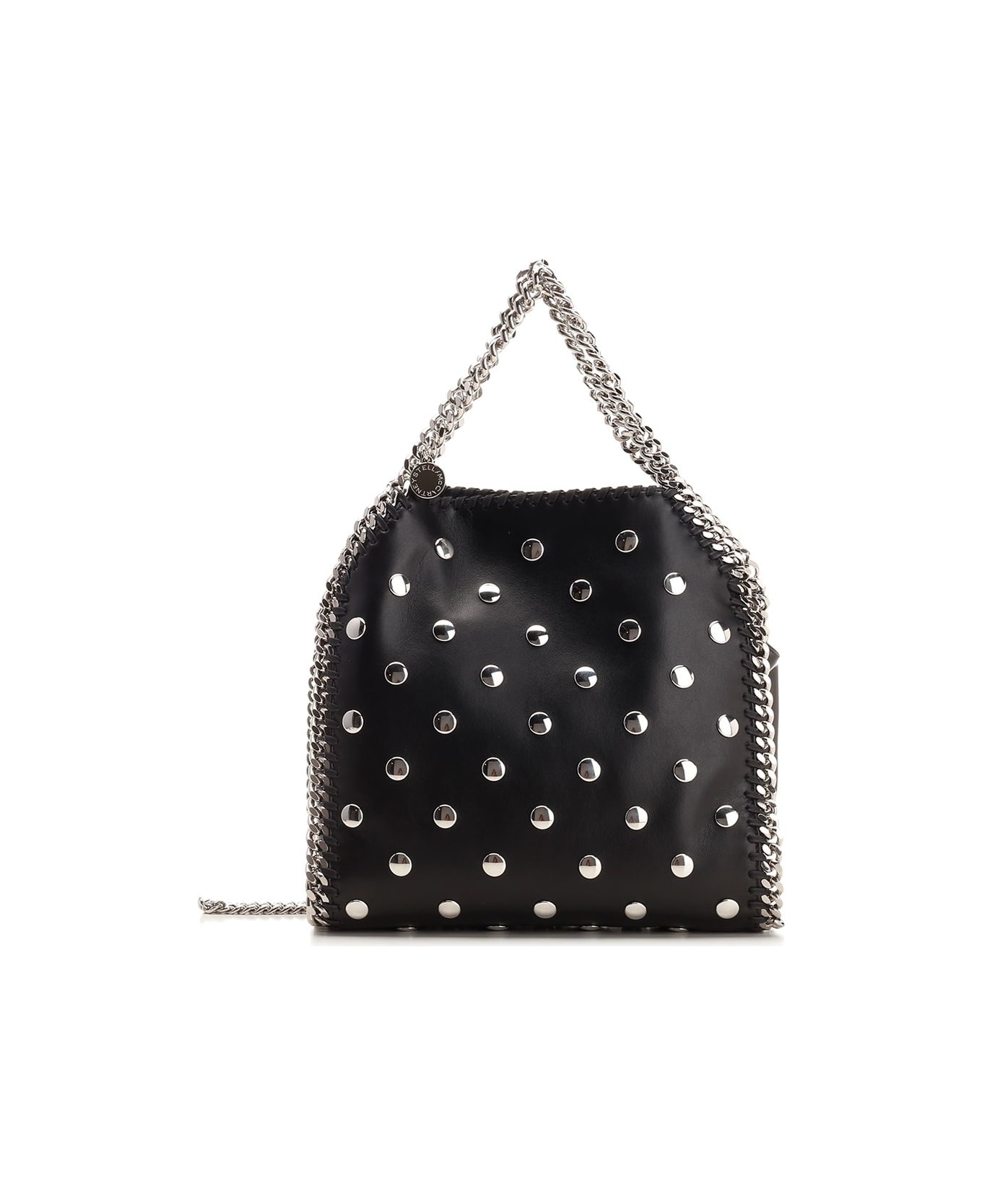 "Falabella" mini tote from Stella McCartney in soft pitch black vegan material with all-over flat studs, iconic silver diamond-effect chain in recycled brass and recyclable aluminum, fixed shoulder strap, recycled polyester lining with all-over logo, internal magnetic button.