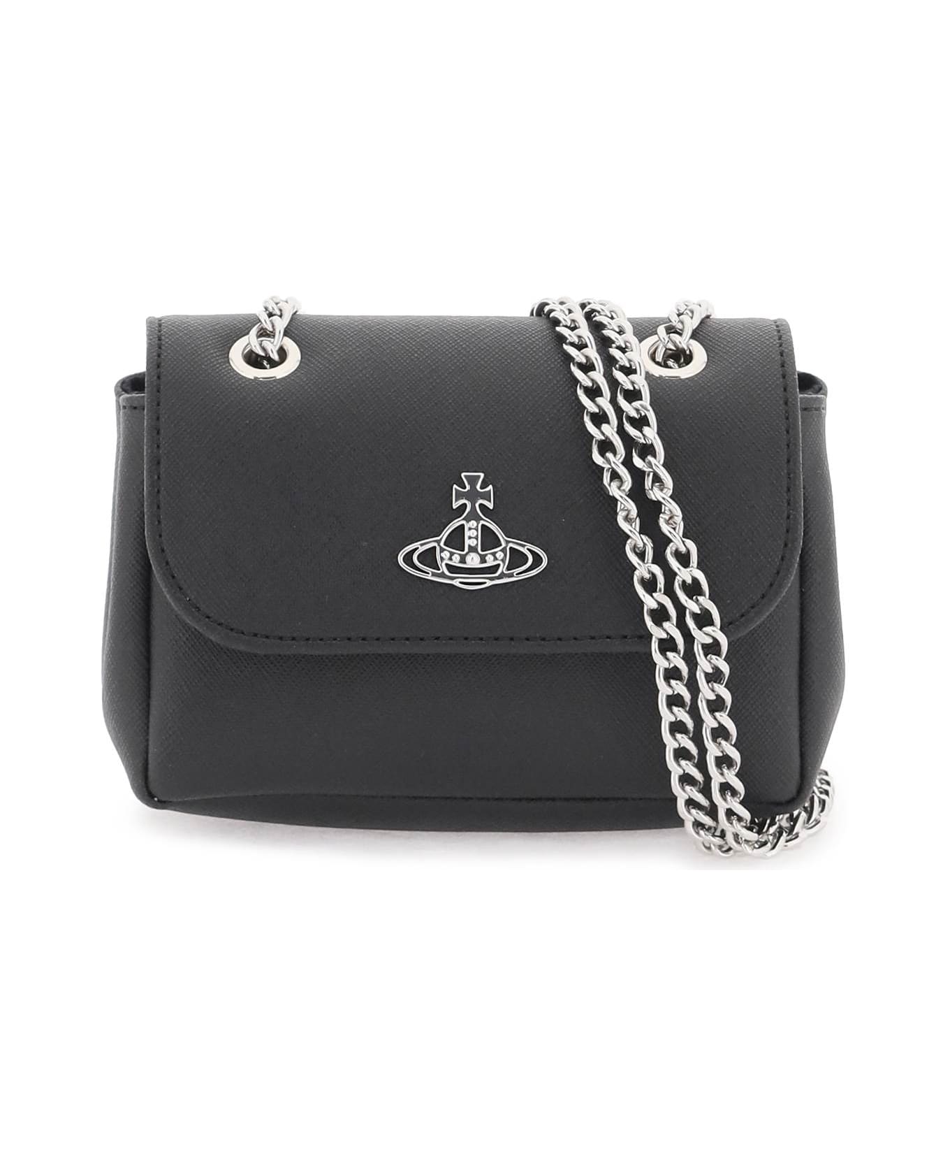 Faux saffiano leather mini bag by Vivienne Westwood with metal Orb logo on the flap. Magnetic closure, fabric interior with logo patch andwith an adjustable double chain strap that allows it to be worn on the shoulder or crossbody. Silver-finished metalware.