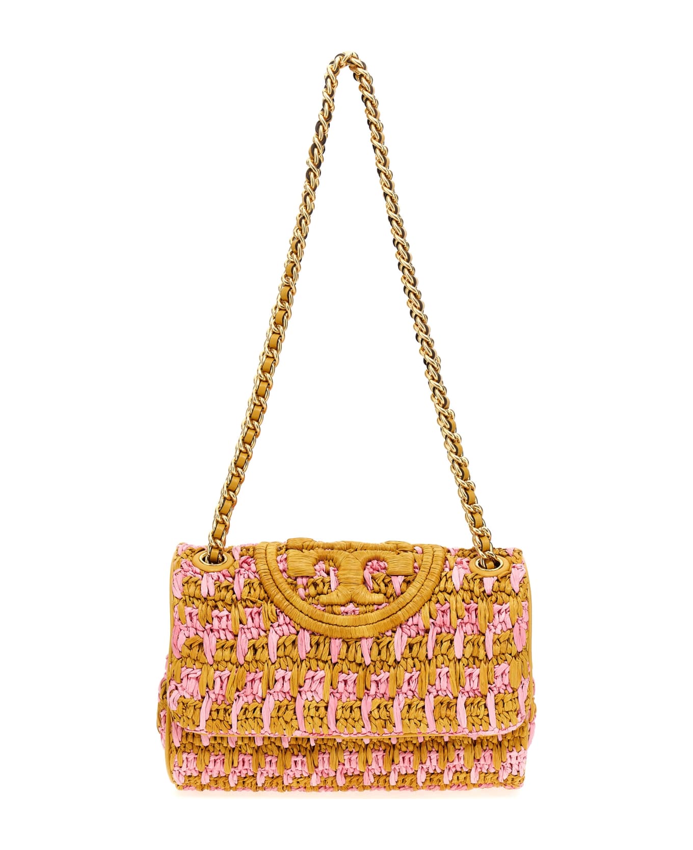 'Fleming Soft Crochet Small' straw shoulder bag woven with logo, leather details, chain and leather handle, magnetic closure.