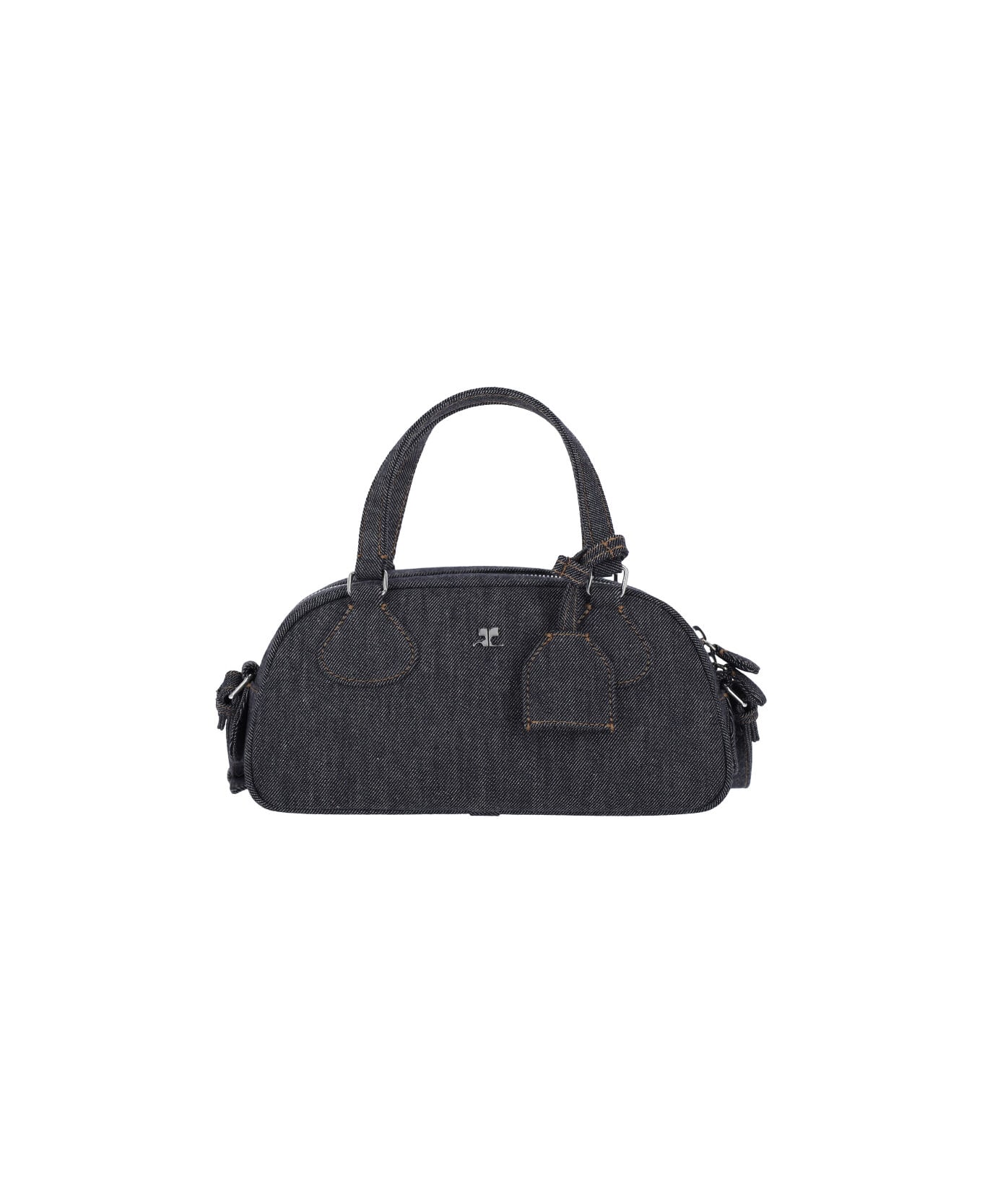 Courrèges 'Friday Bowling' shoulder bag in blue votone denim with two handles, removable ring keyring detail, adjustable shoulder strap, double zip closure, silver metal 'Ac' logo on the front, embossed logo detail, inner card slot, main inner compartment.