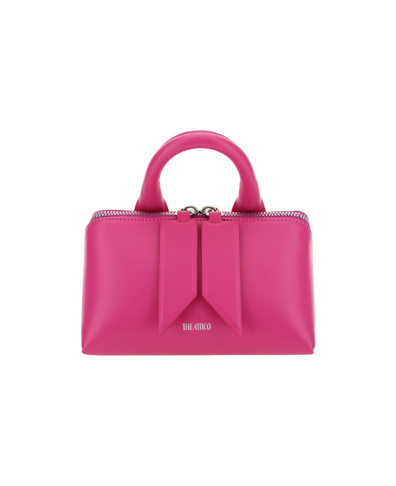 Calfskin friday mini handbag by the attico, removable and adjustable flat leather shoulder strap, geometric shape, asymmetrical top zipper closure, double geometric pull, iconic brand monogram in contrasting pressure on front, single top stiff handle, interior flat pocket, protective metal feet on base of bag.